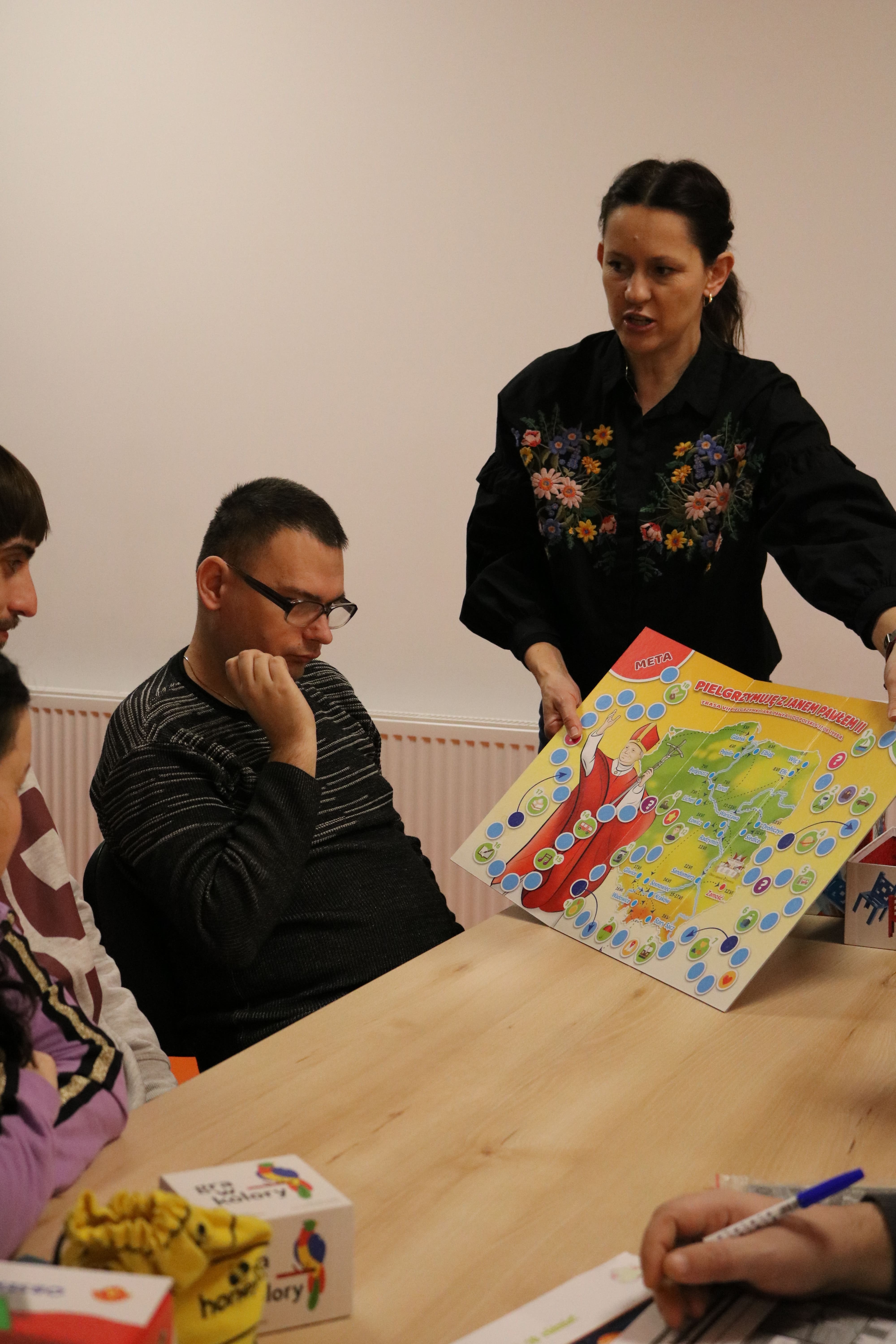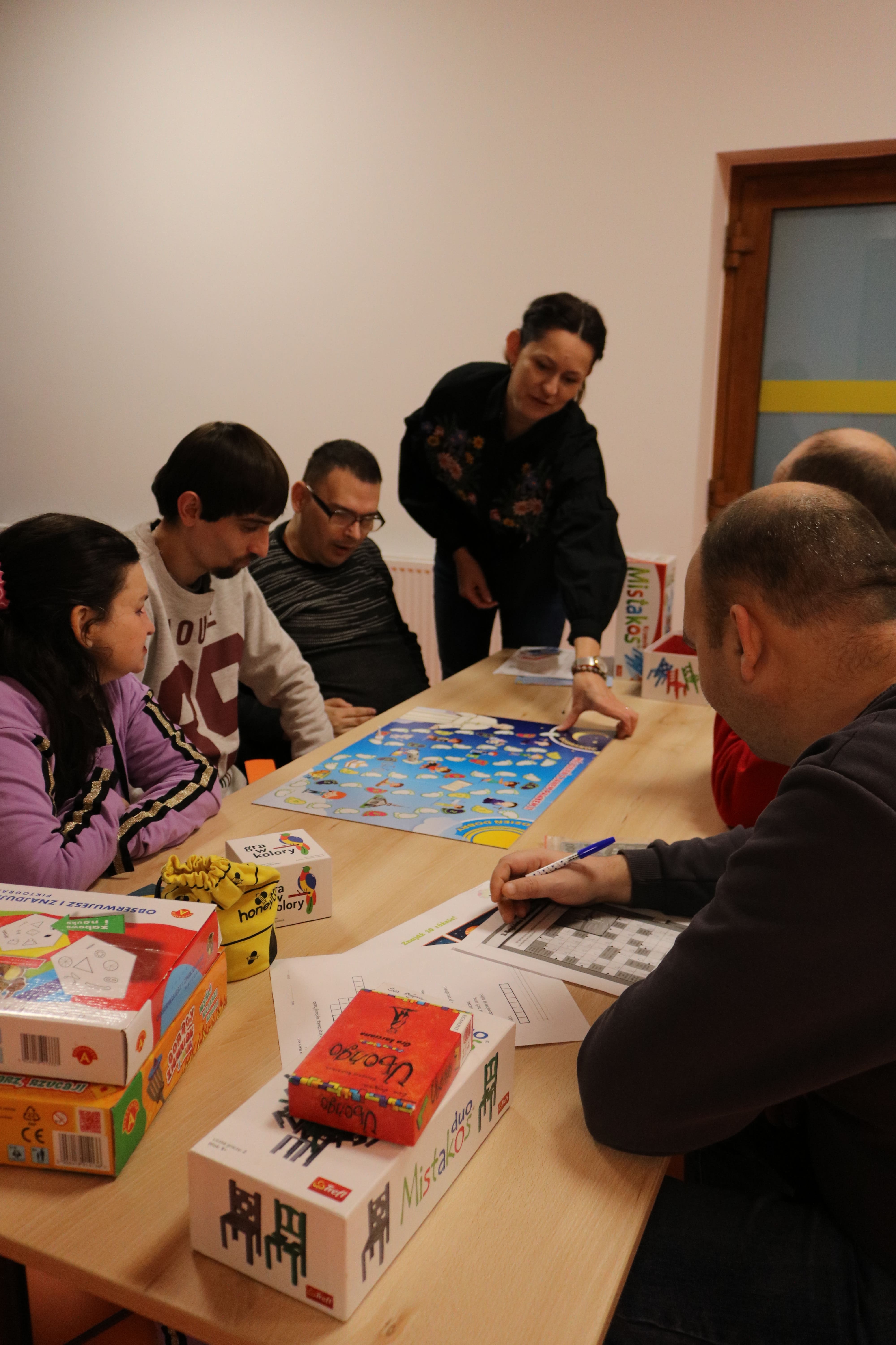 W tym dniu, głównym celem zajęć było rozwijanie umiejętności logicznego myślenia oraz poprawa zdolności manualnych uczestników poprzez różnorodne formy aktywności, takie jak łamigłówki, gry planszowe oraz układanie puzzli. Uczestnicy zostali zapoznani z różnymi rodzajami gier i łamigłówek, co umożliwiło rozwijanie ich zdolności do rozwiązywania problemów oraz wspólnej integracji. W trakcie zajęć kładziono również nacisk na współpracę w grupie, wzajemną życzliwość i szacunek, a także na rozwijanie umiejętności interpersonalnych poprzez wspólne gry. Zajęcia przebiegały w różnych formach, w tym metodą oglądową, słowną oraz praktycznego działania, dzięki czemu uczestnicy mogli nie tylko zdobyć wiedzę teoretyczną, ale także praktycznie ją zastosować. Zajęcia były prowadzone zarówno w formie indywidualnej, jak i grupowej, co sprzyjało integracji uczestników oraz pozwalało na różnorodne podejście do omawianych zagadnień. W trakcie zajęć uczestnicy mieli dostęp do różnych łamigłówek, gier planszowych, puzzli w różnych wariantach, do których wykorzystano rozmaite materiały: instrukcje do układania puzzli, zagadki logiczne, zestawy łamigłówek, kostki do gier planszowych oraz pionki i plansze.