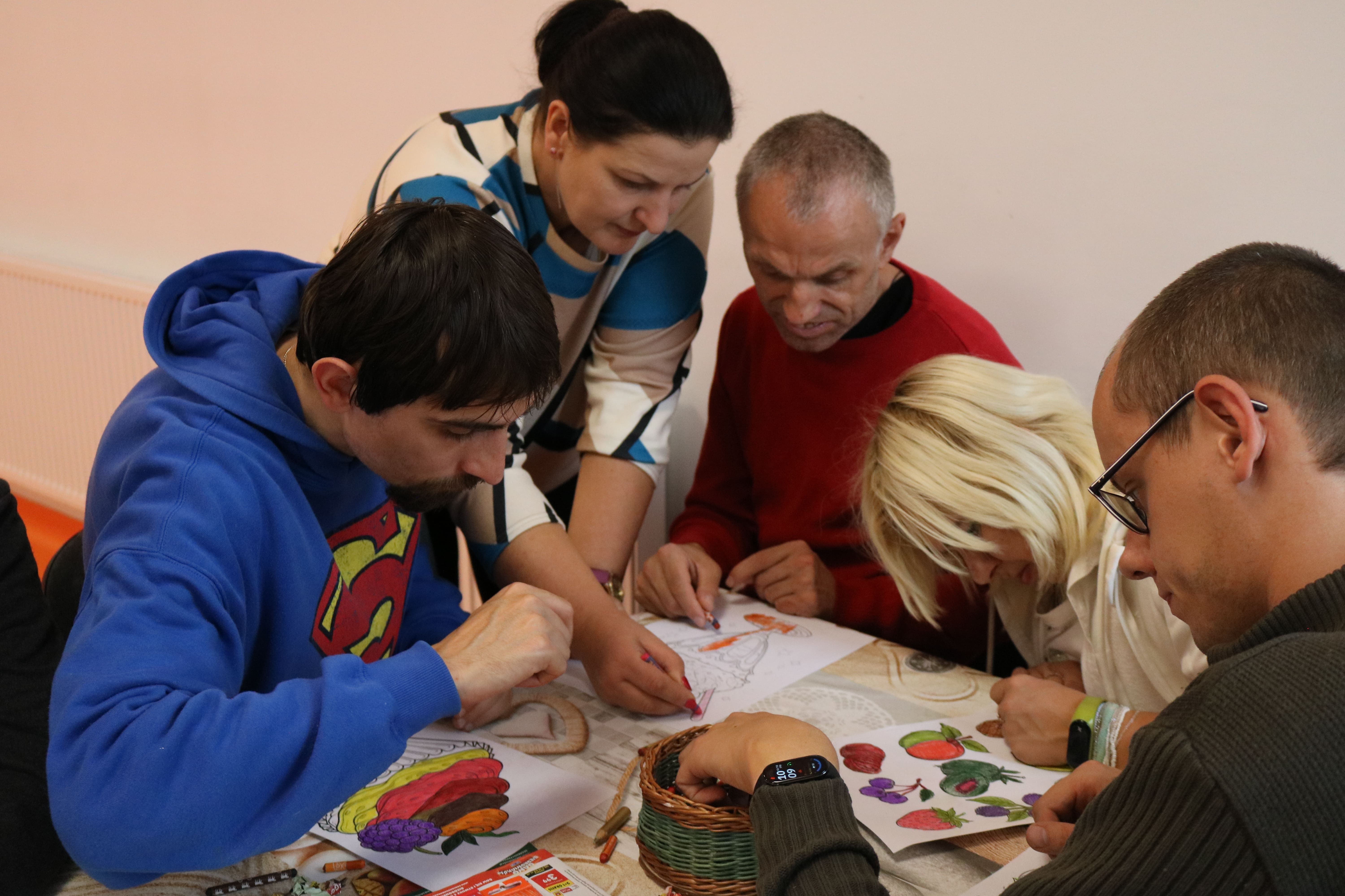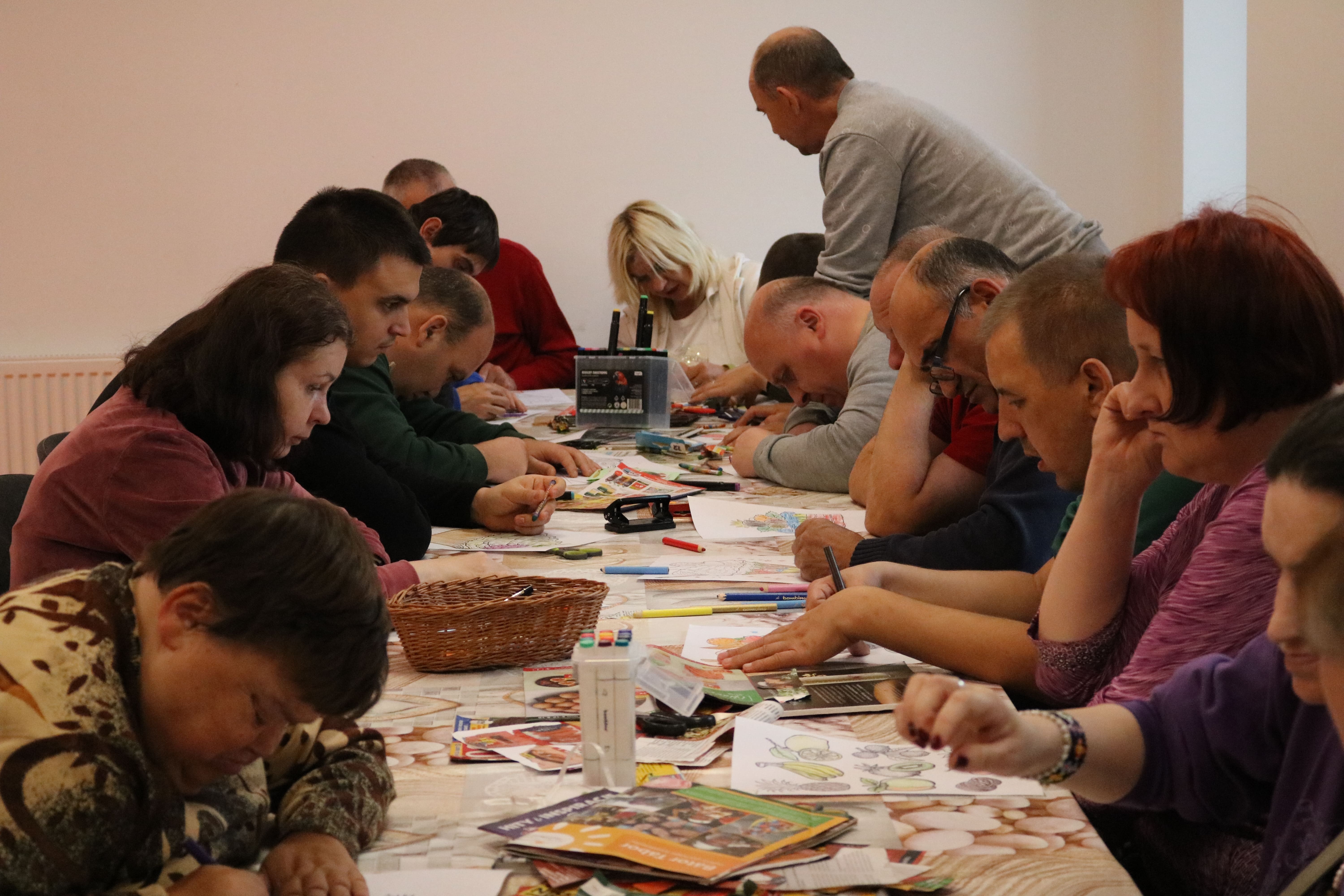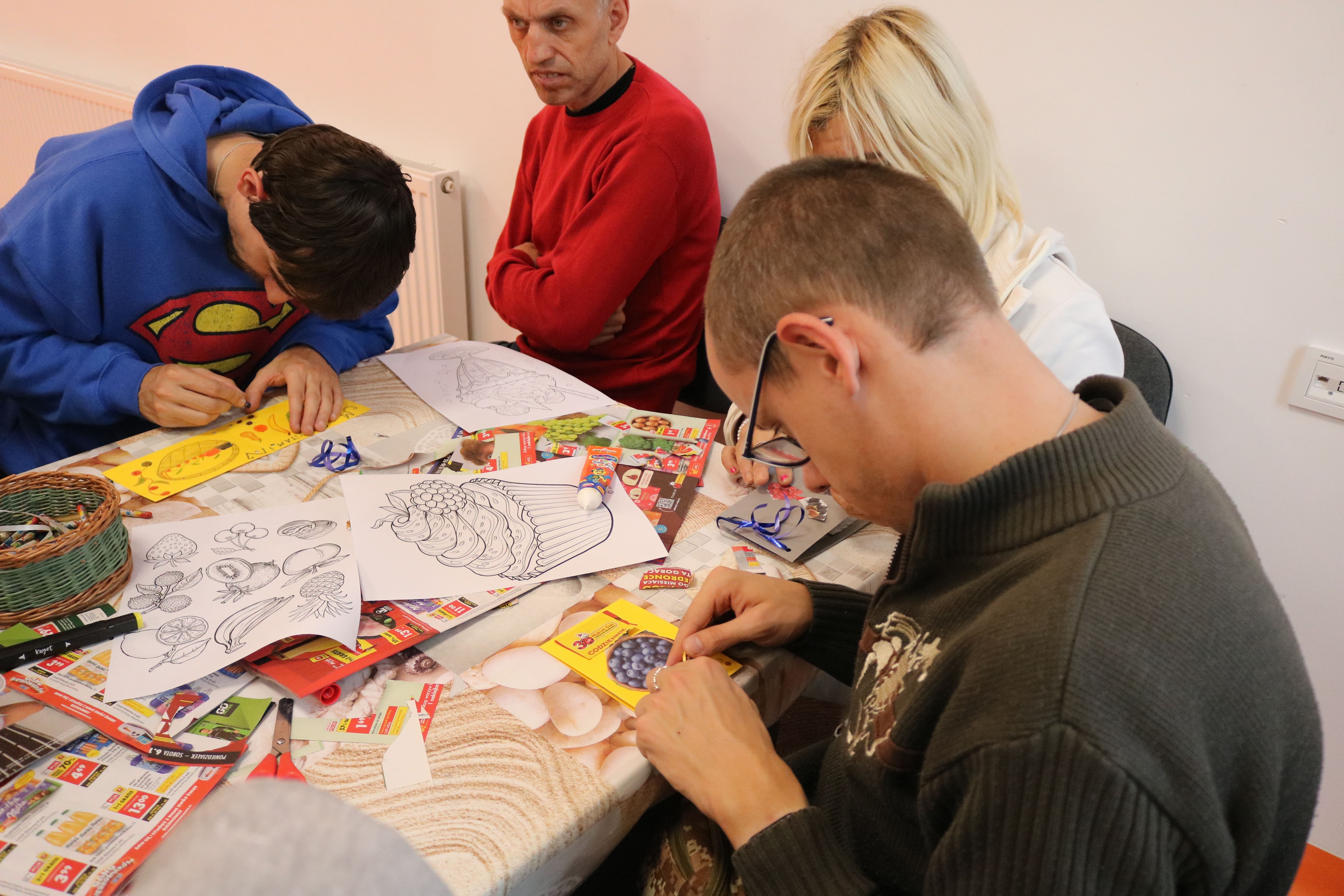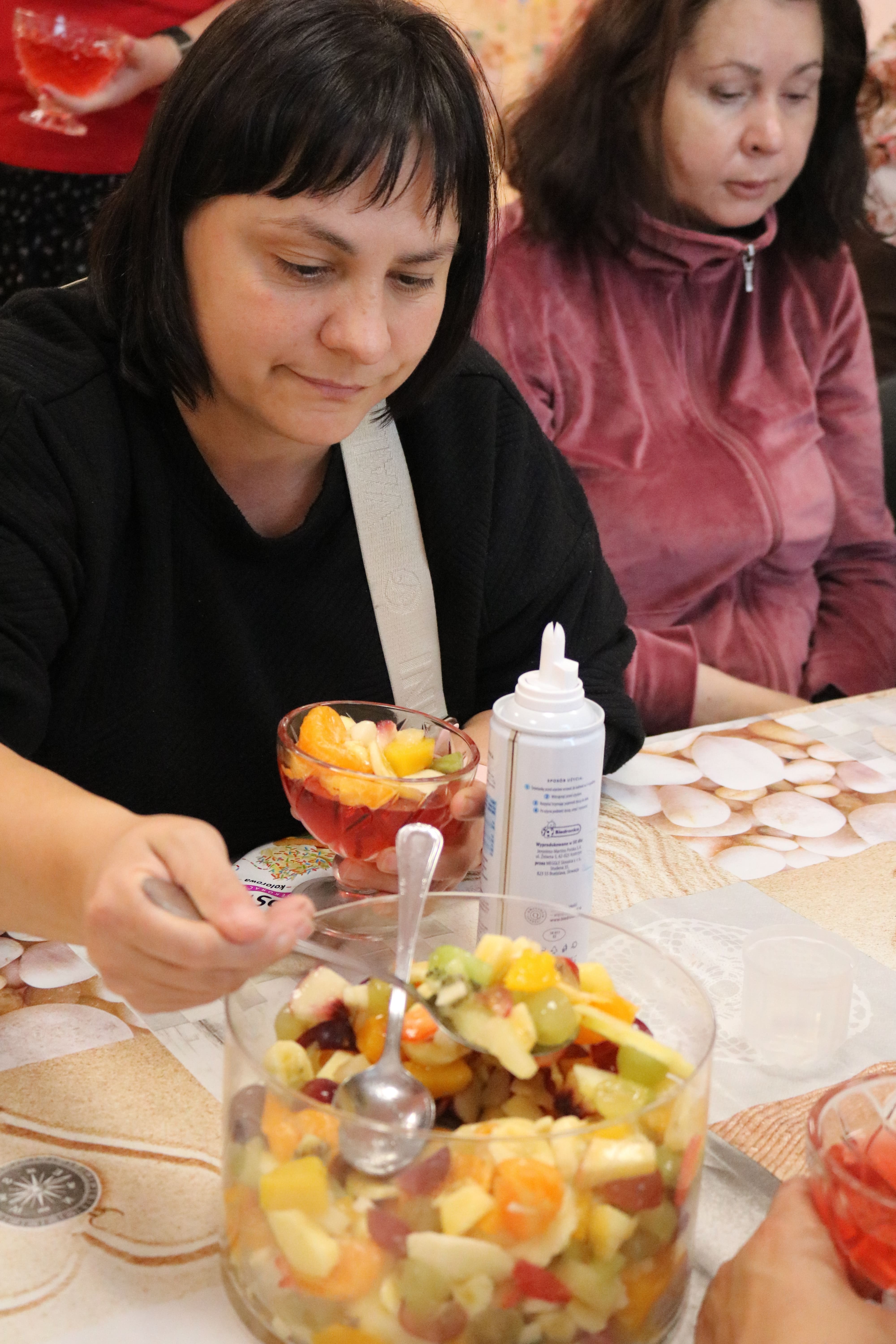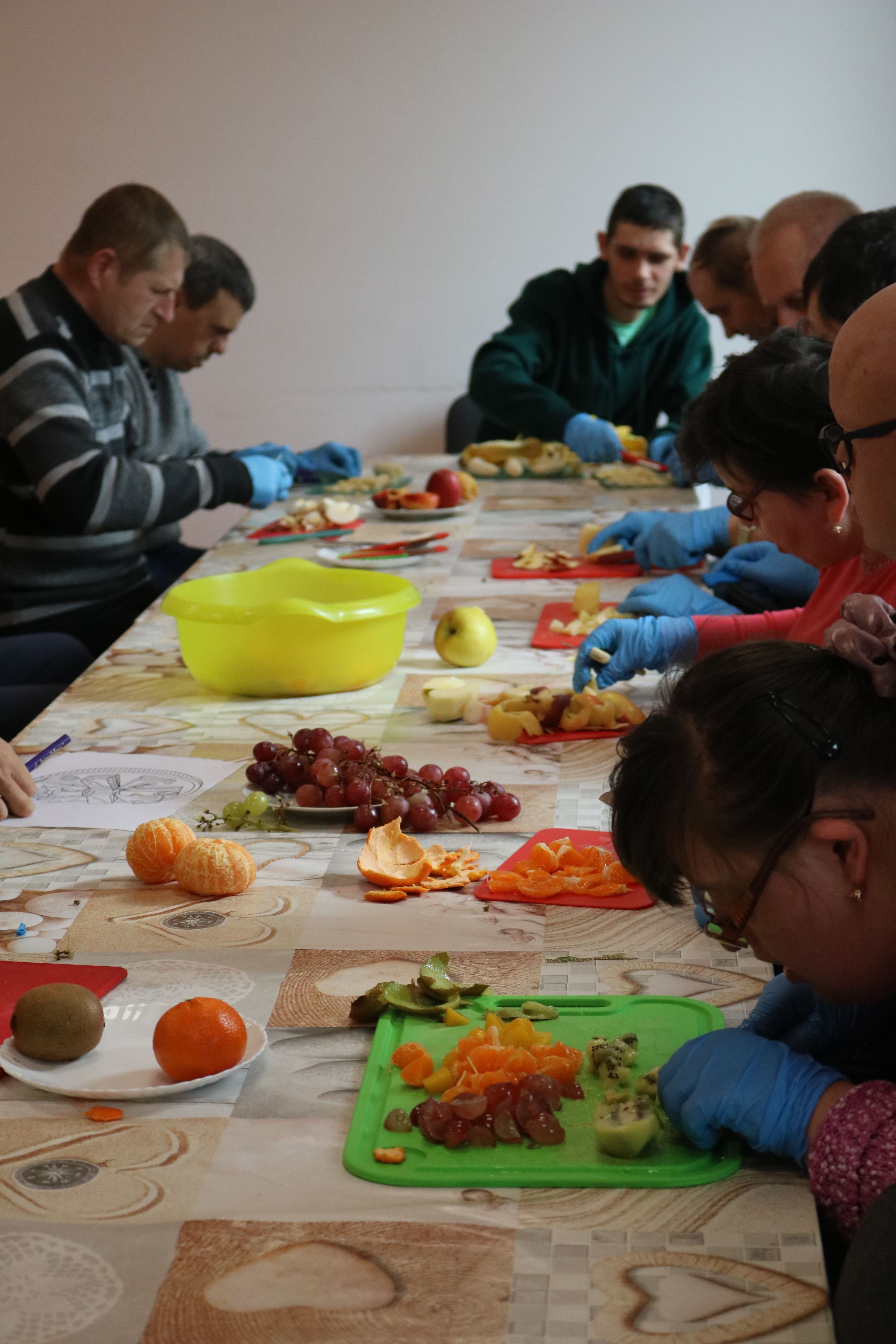 Po zakończeniu części plastycznej odbyła się dyskusja na temat potraw, które można przygotować z owoców i warzyw. Uczestnicy wymieniali się przepisami na zdrowe desery – takimi jak sałatki owocowe, galaretki, kompoty, soki czy ciasta. Ten etap pozwolił poszerzyć wiedzę o alternatywach dla tradycyjnych, kalorycznych słodyczy. Instruktorzy wspólnie z uczestnikami omawiali także wartości odżywcze owoców oraz ich znaczenie w codziennej diecie, zachęcając do ich częstszego spożywania w różnych formach.