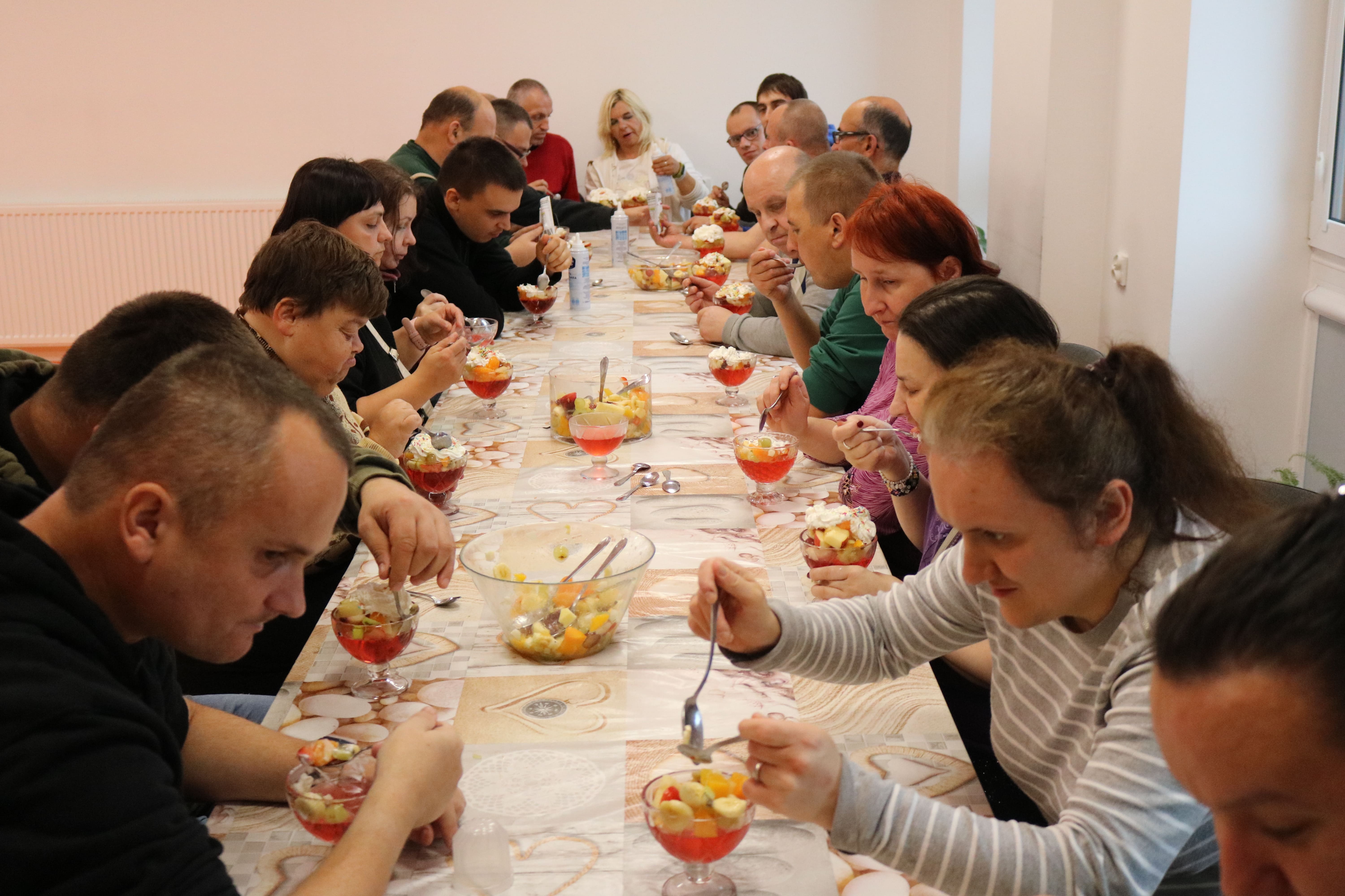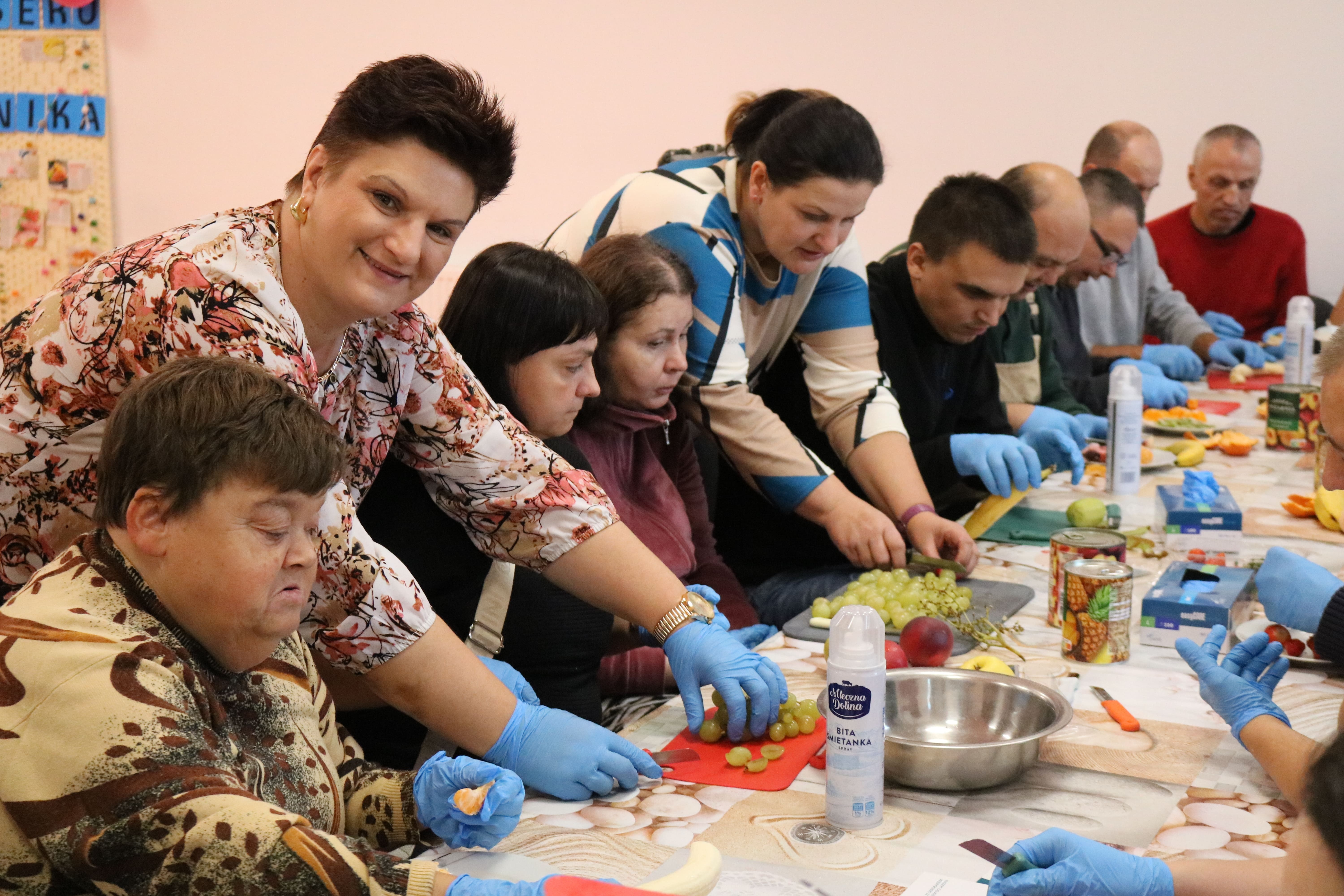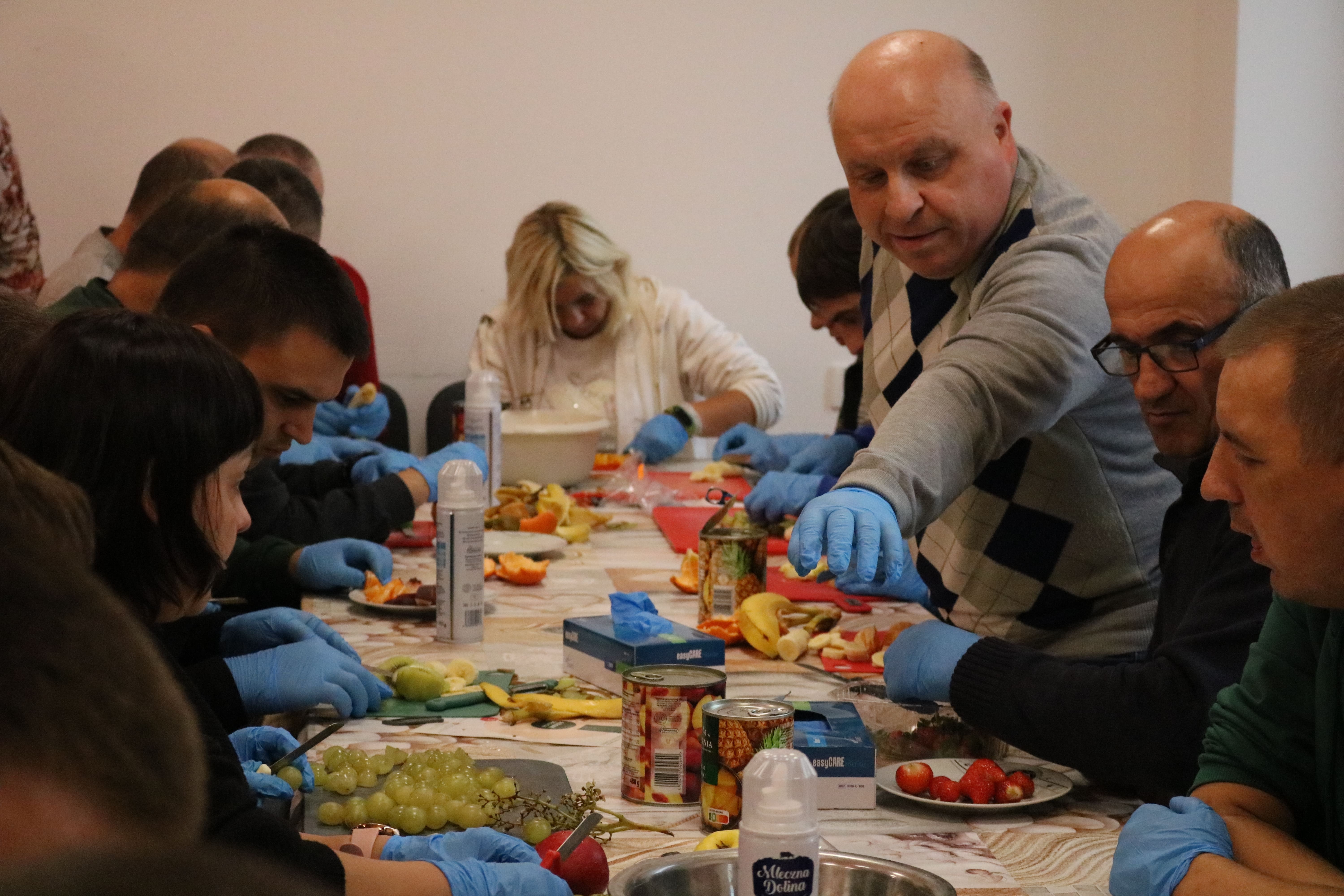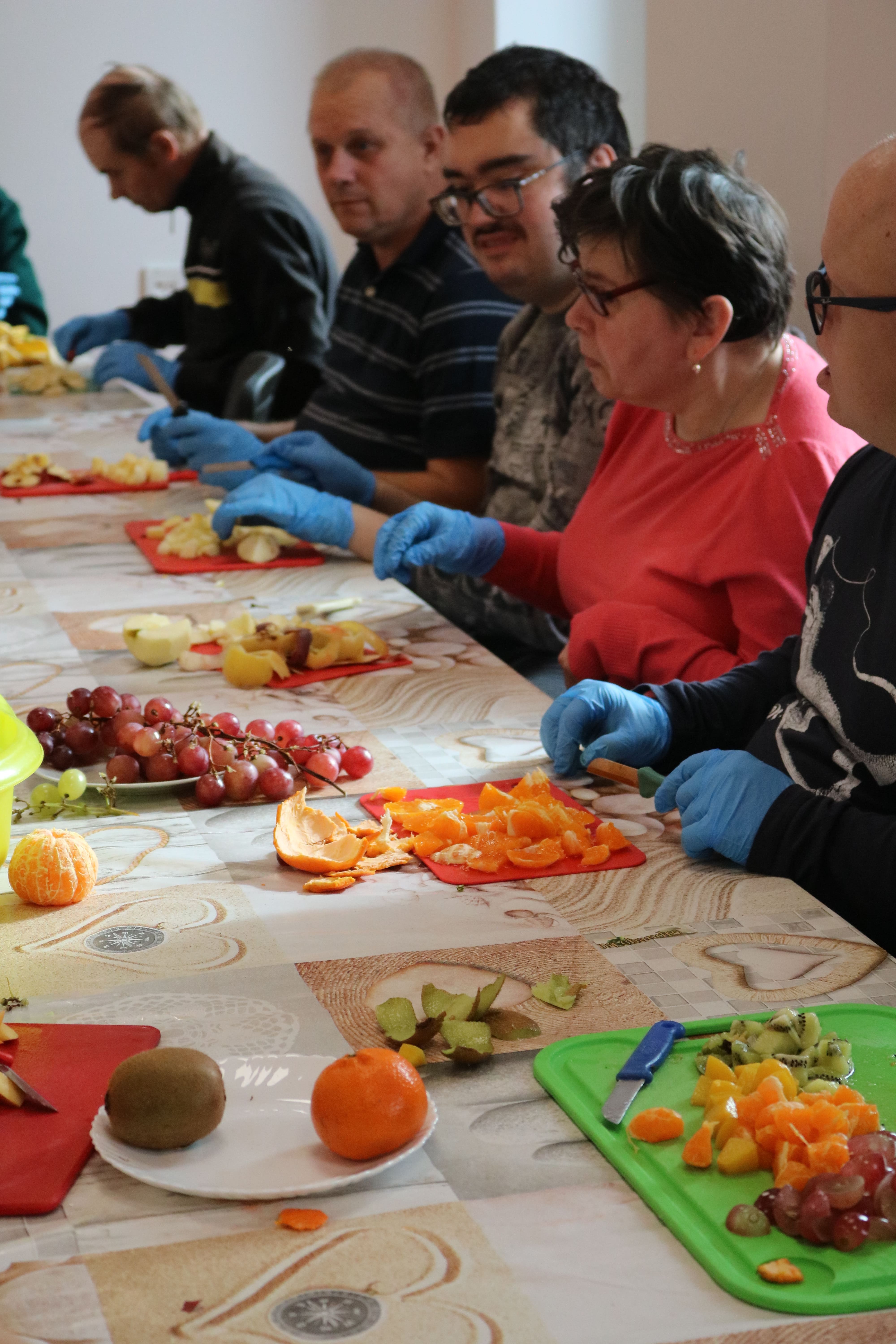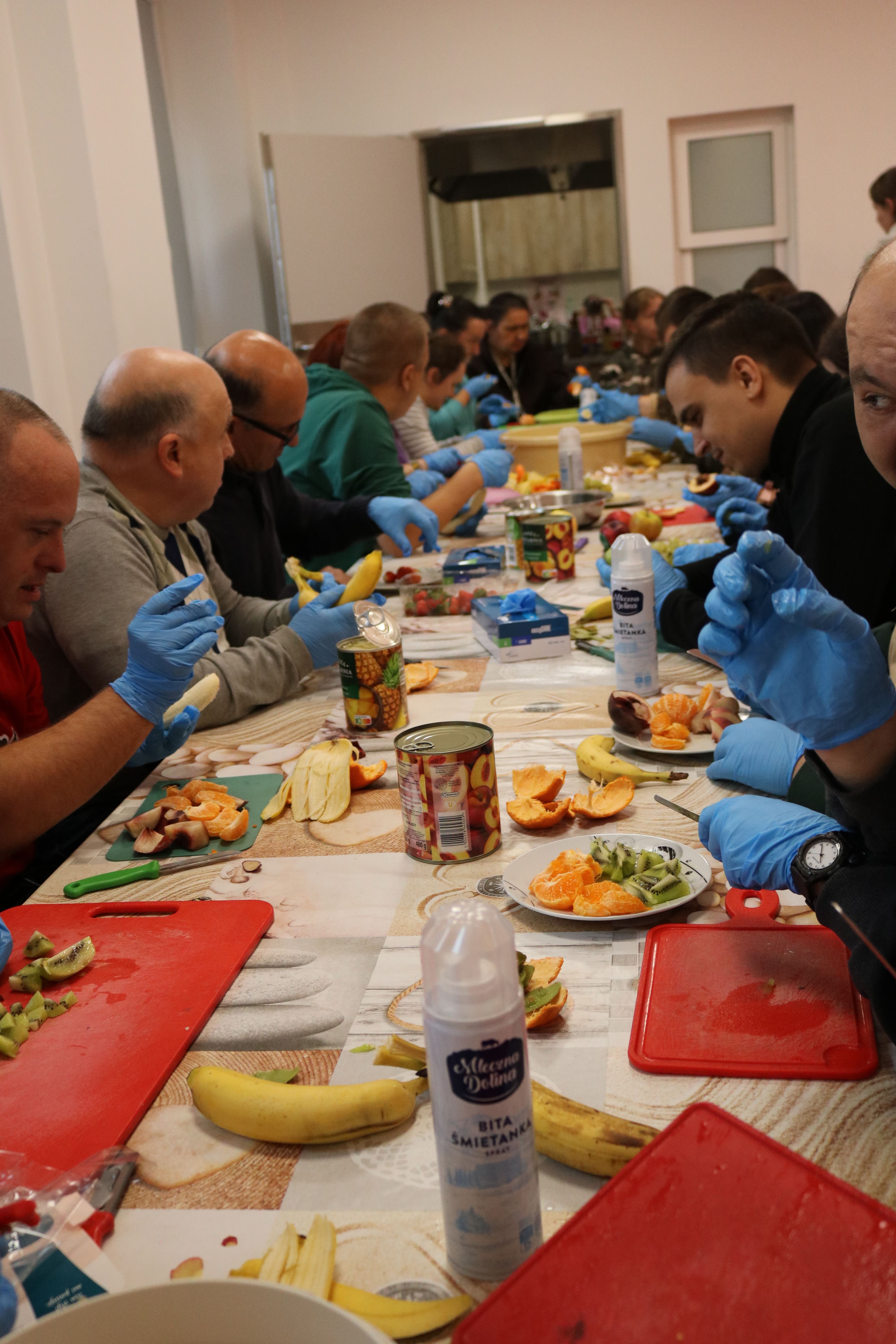 Kulminacyjnym punktem zajęć było wspólne przygotowywanie deserów. Pod opieką instruktorów uczestnicy przygotowali stanowiska pracy i przystąpili do wykonania zadania. Poznali zasady prawidłowego obchodzenia się z owocami oraz dbania o higienę i bezpieczeństwo w kuchni. W trakcie tego etapu obierali owoce, kroili je na odpowiednie kawałki, a następnie tworzyli własne desery, wykorzystując galaretki i inne dodatki. Po skończeniu własnych kompozycji deserowych, nadszedł czas na degustację. To był pełen radości i dumy moment, gdy uczestnicy mogli spróbować efektów swojej pracy. Po wspólnej „smacznej integracji” wszyscy zabrali się do sprzątania stanowisk, wykonując to zadanie z zaangażowaniem oraz dużą odpowiedzialnością, dbając o porządek.