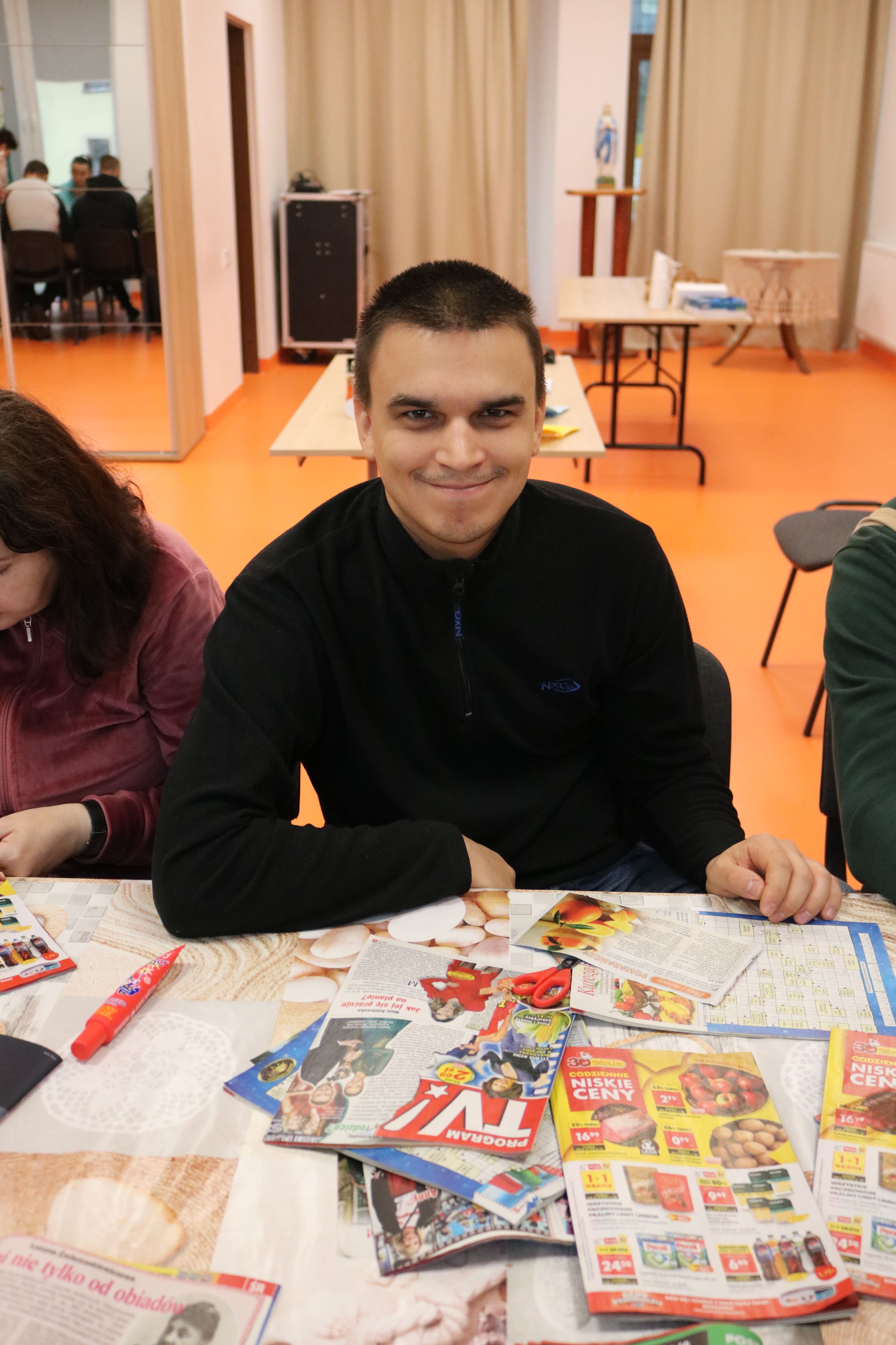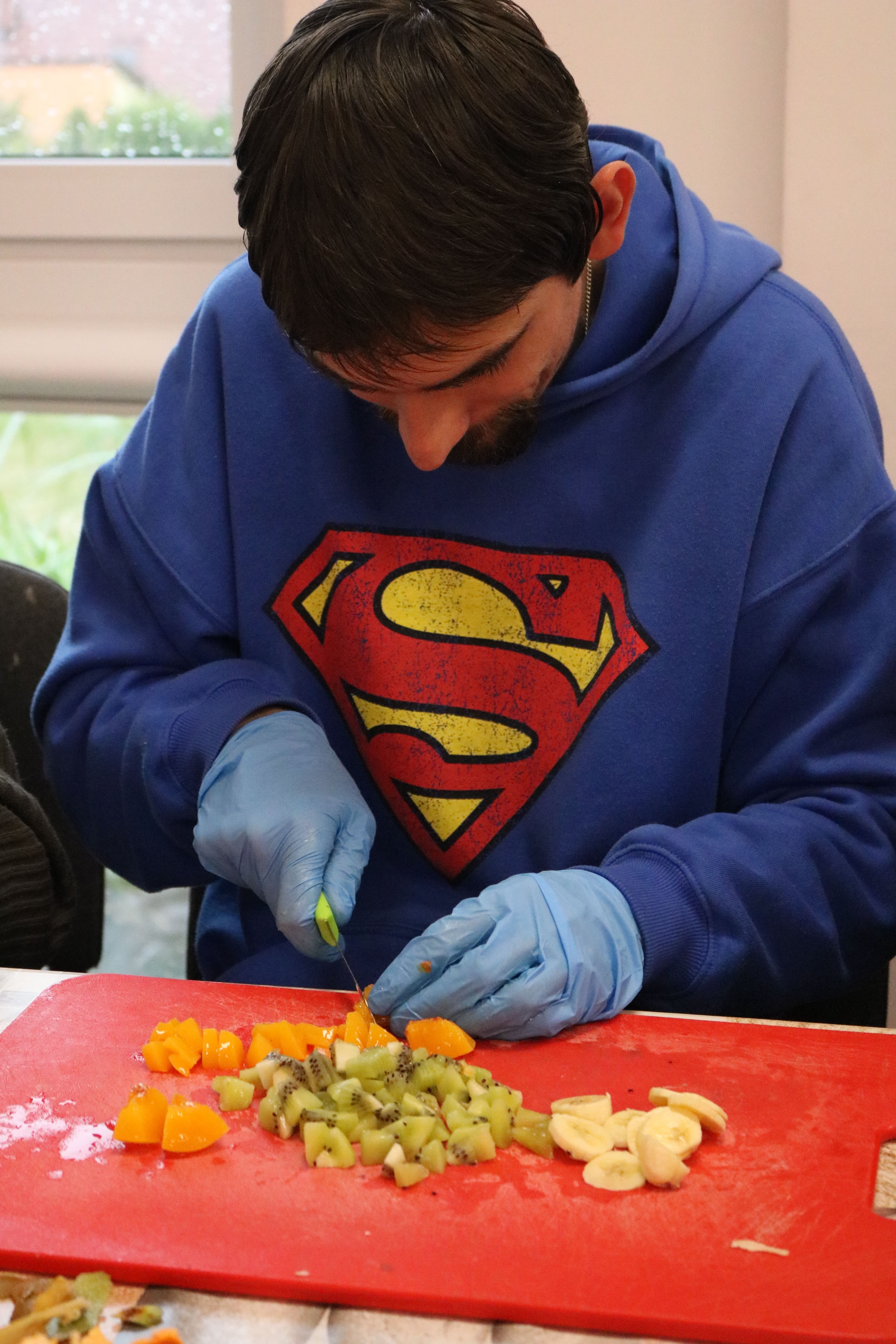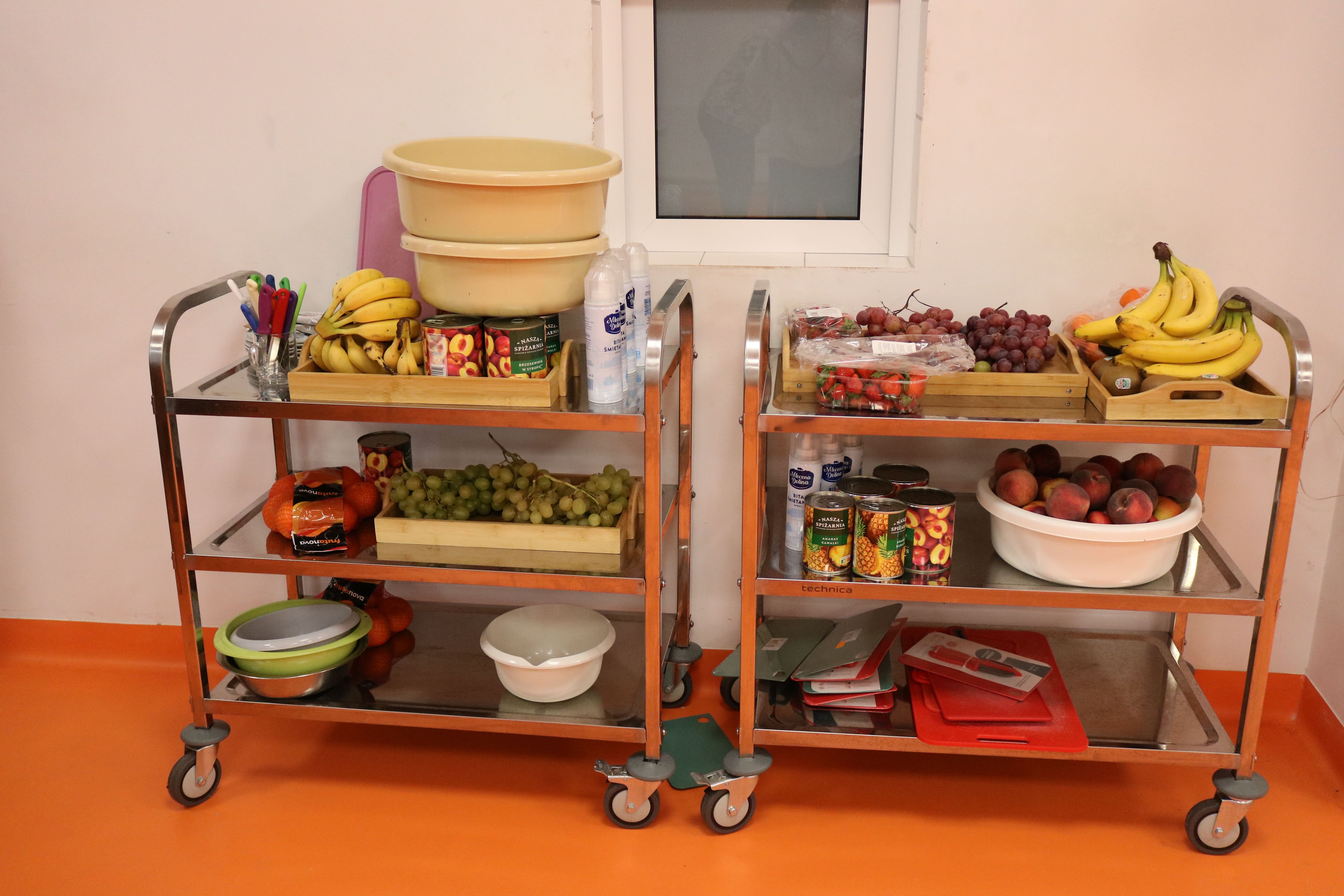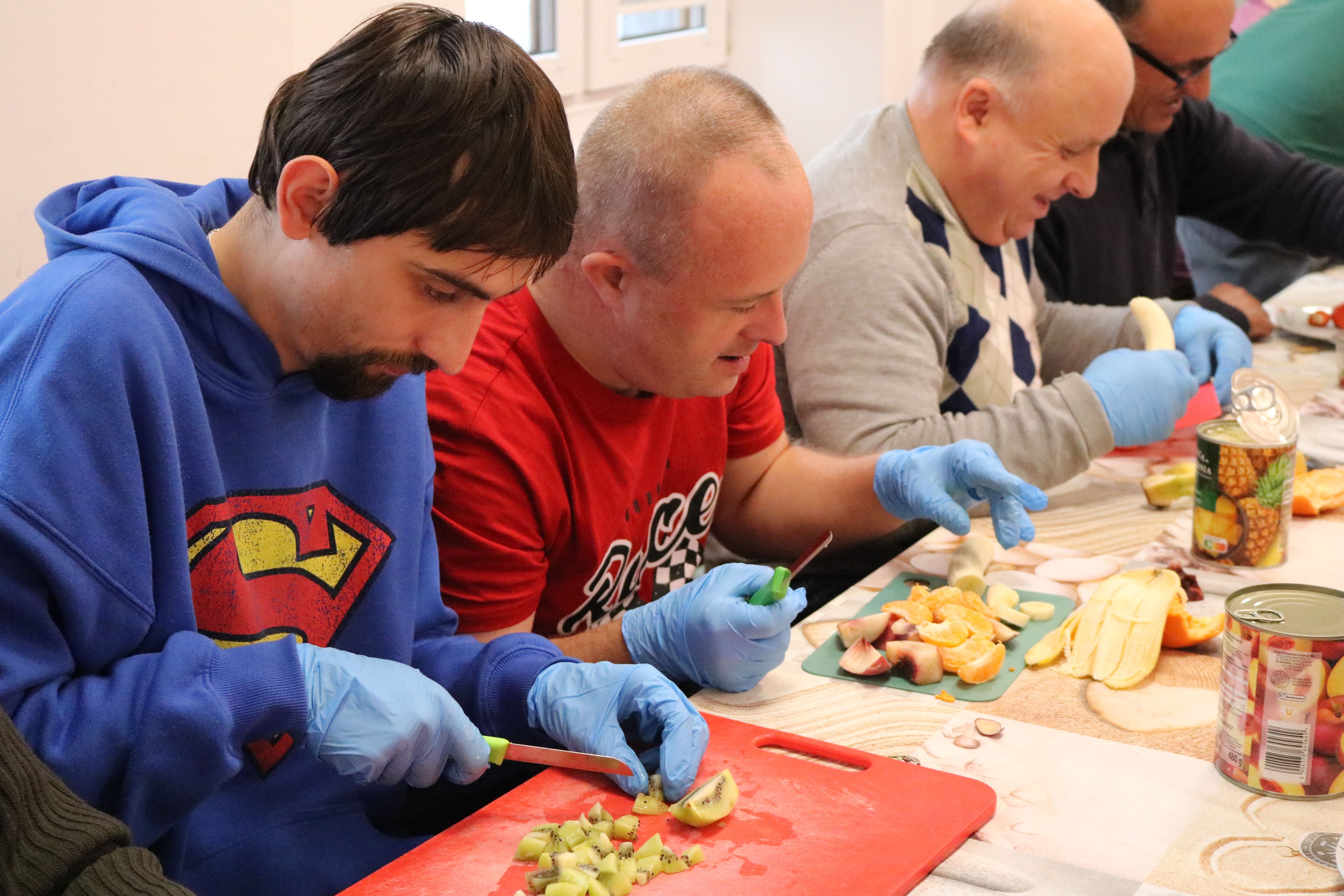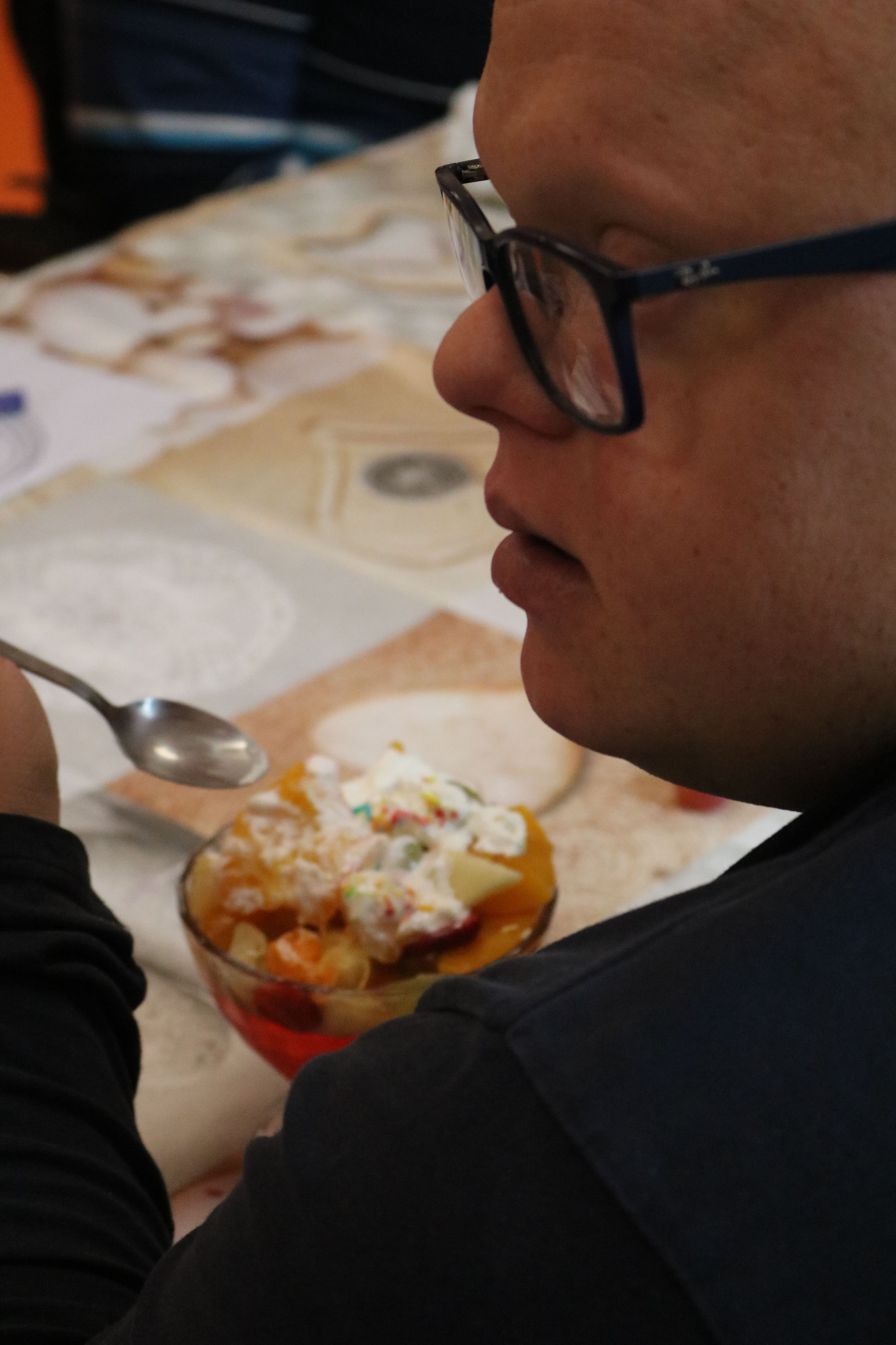 Kulminacyjnym punktem zajęć było wspólne przygotowywanie deserów. Pod opieką instruktorów uczestnicy przygotowali stanowiska pracy i przystąpili do wykonania zadania. Poznali zasady prawidłowego obchodzenia się z owocami oraz dbania o higienę i bezpieczeństwo w kuchni. W trakcie tego etapu obierali owoce, kroili je na odpowiednie kawałki, a następnie tworzyli własne desery, wykorzystując galaretki i inne dodatki. Po skończeniu własnych kompozycji deserowych, nadszedł czas na degustację. To był pełen radości i dumy moment, gdy uczestnicy mogli spróbować efektów swojej pracy. Po wspólnej „smacznej integracji” wszyscy zabrali się do sprzątania stanowisk, wykonując to zadanie z zaangażowaniem oraz dużą odpowiedzialnością, dbając o porządek.