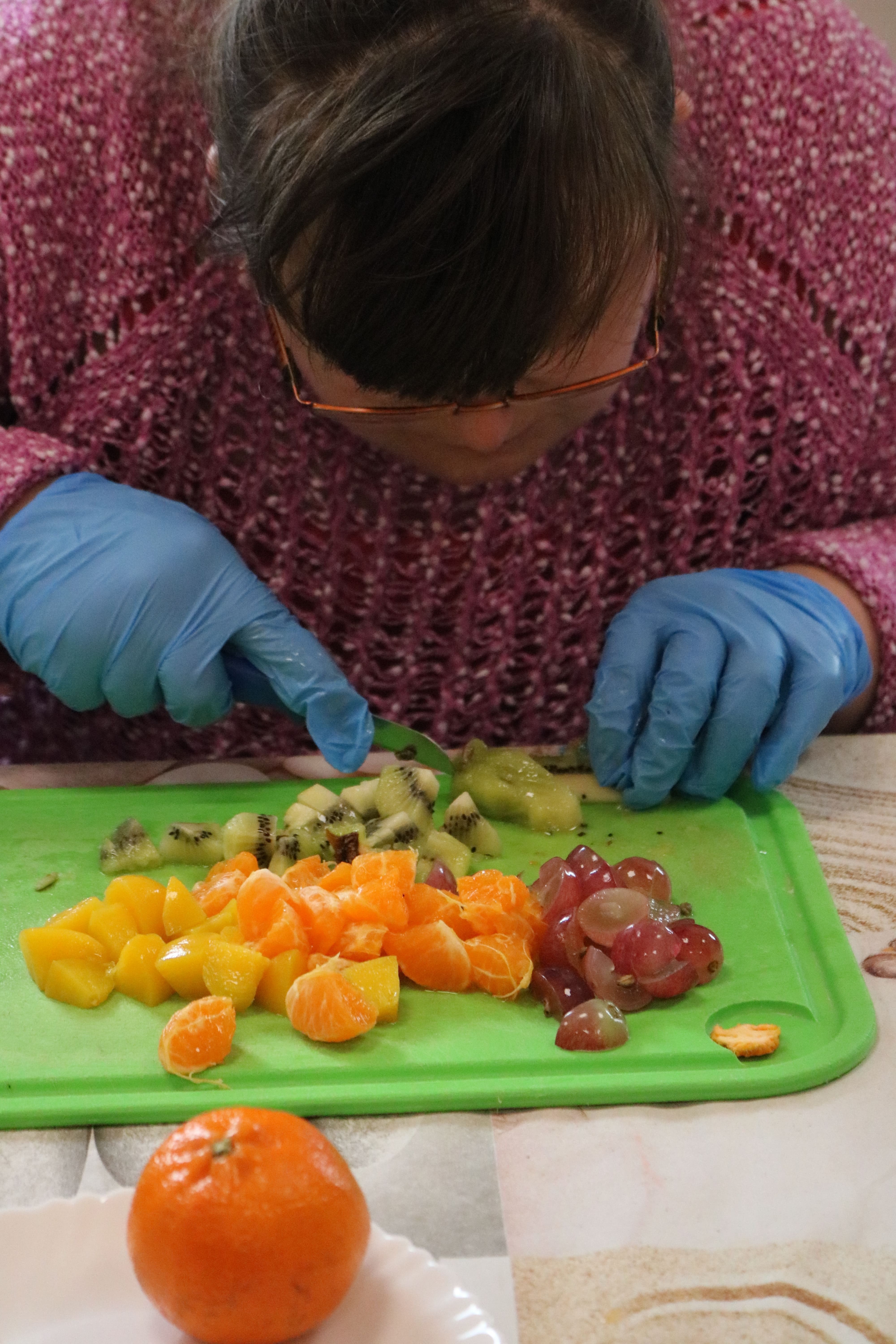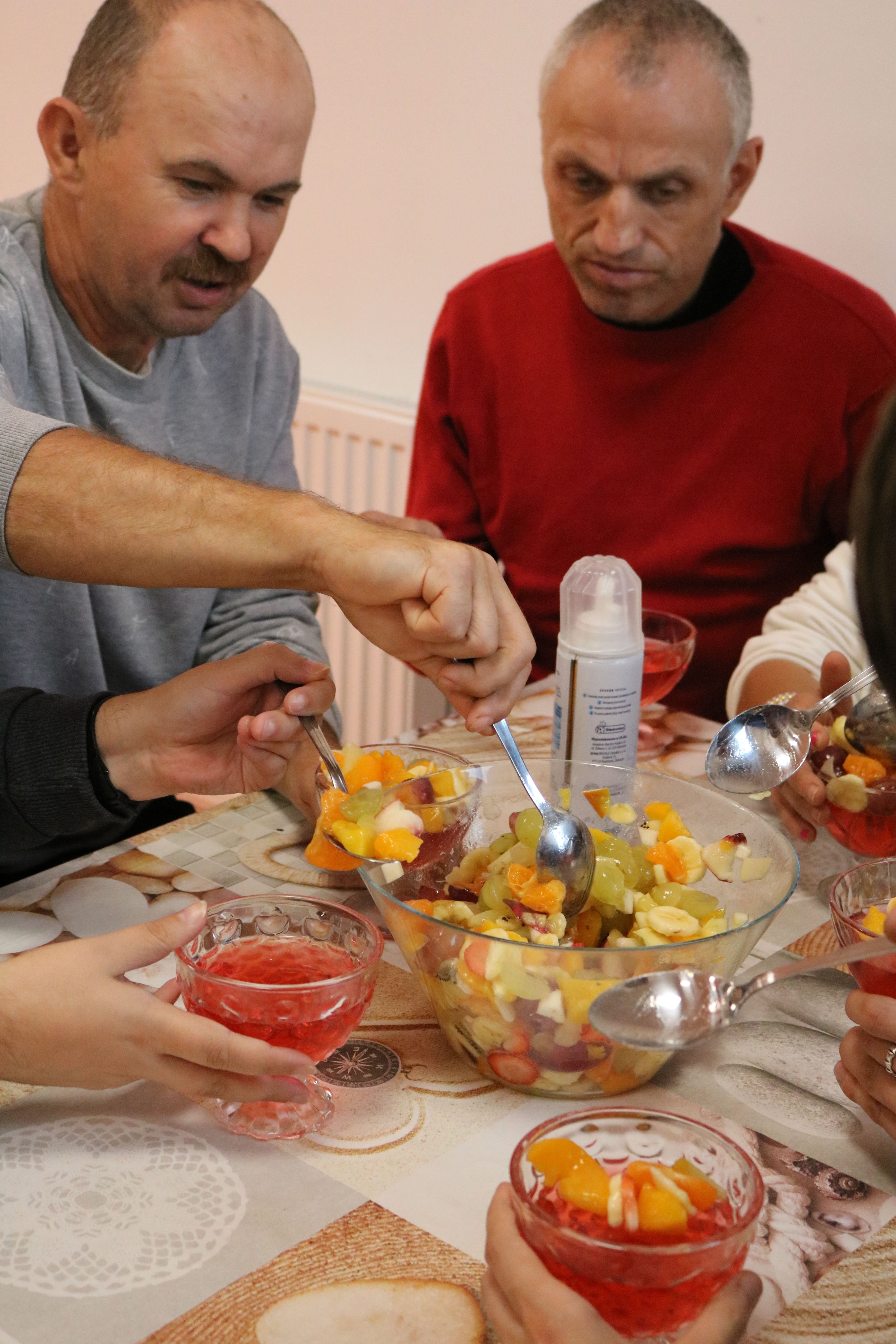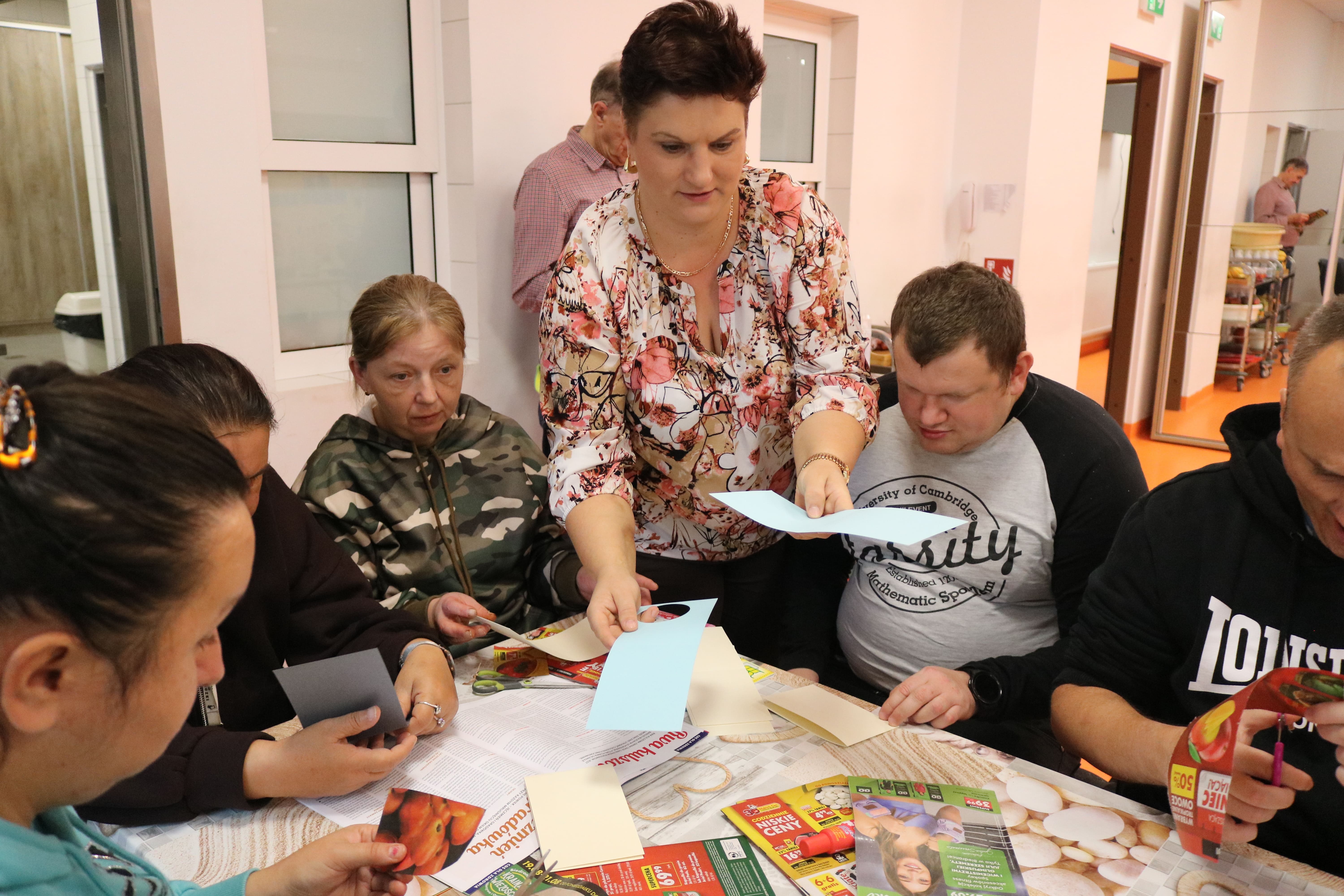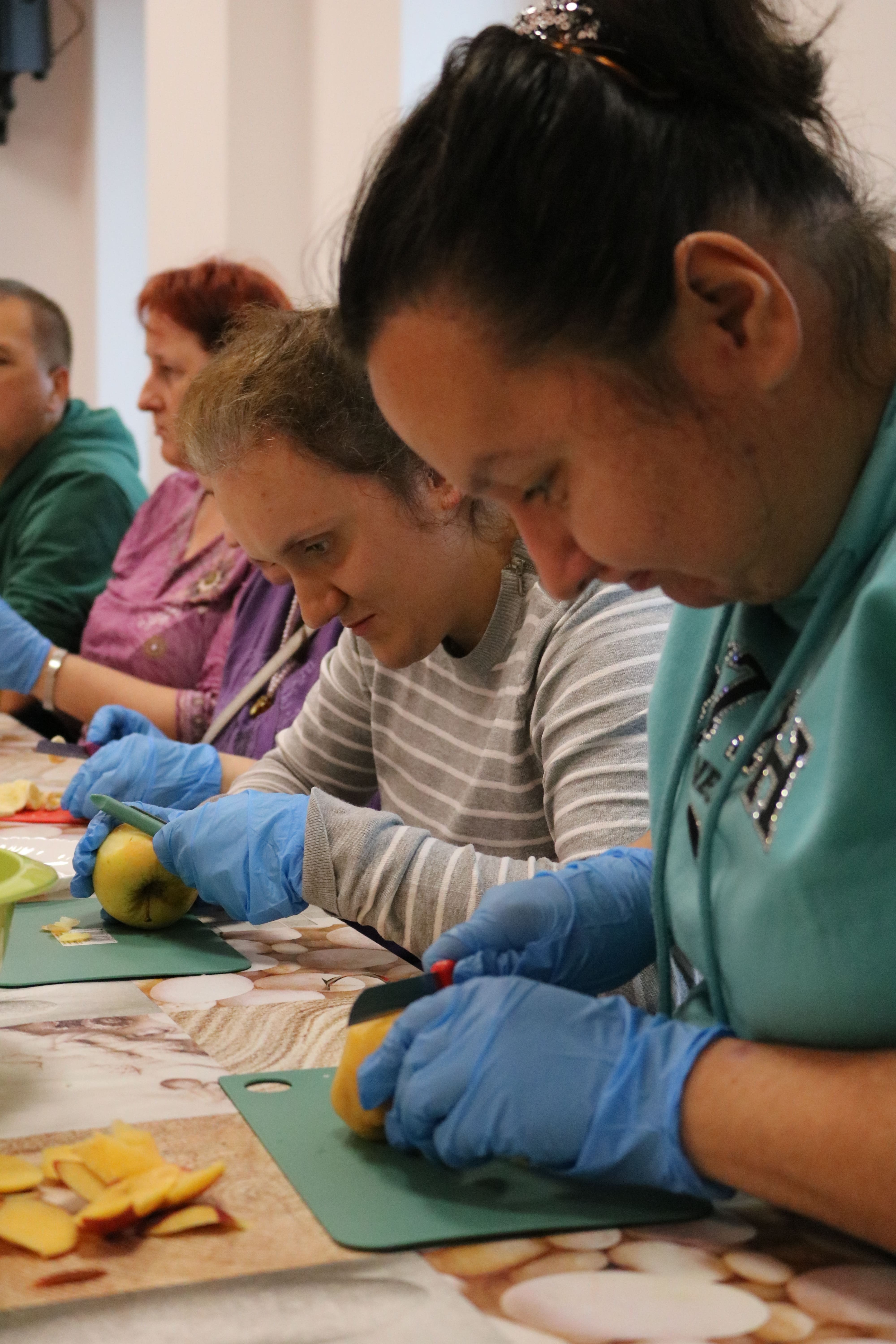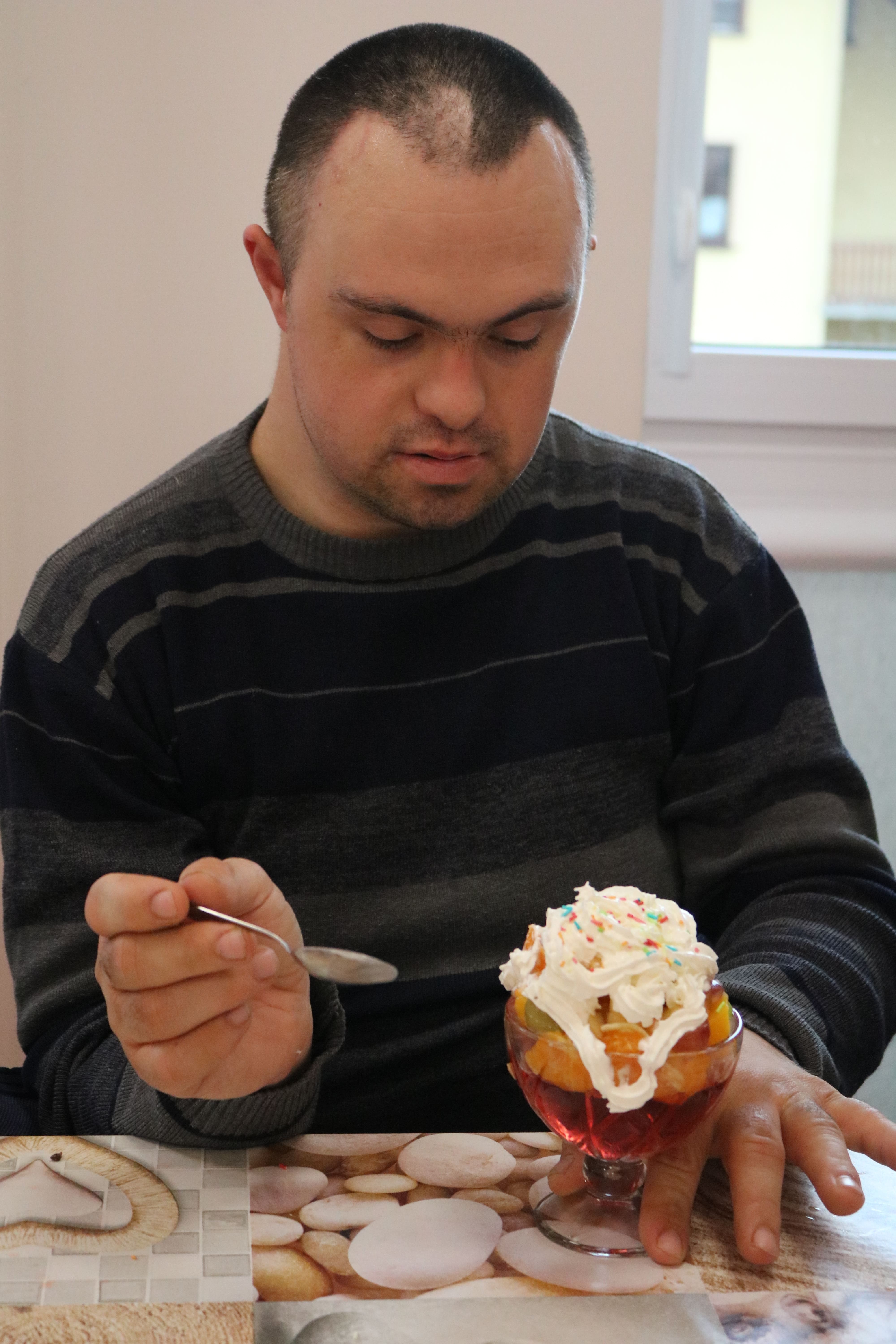 Kulminacyjnym punktem zajęć było wspólne przygotowywanie deserów. Pod opieką instruktorów uczestnicy przygotowali stanowiska pracy i przystąpili do wykonania zadania. Poznali zasady prawidłowego obchodzenia się z owocami oraz dbania o higienę i bezpieczeństwo w kuchni. W trakcie tego etapu obierali owoce, kroili je na odpowiednie kawałki, a następnie tworzyli własne desery, wykorzystując galaretki i inne dodatki. Po skończeniu własnych kompozycji deserowych, nadszedł czas na degustację. To był pełen radości i dumy moment, gdy uczestnicy mogli spróbować efektów swojej pracy. Po wspólnej „smacznej integracji” wszyscy zabrali się do sprzątania stanowisk, wykonując to zadanie z zaangażowaniem oraz dużą odpowiedzialnością, dbając o porządek.