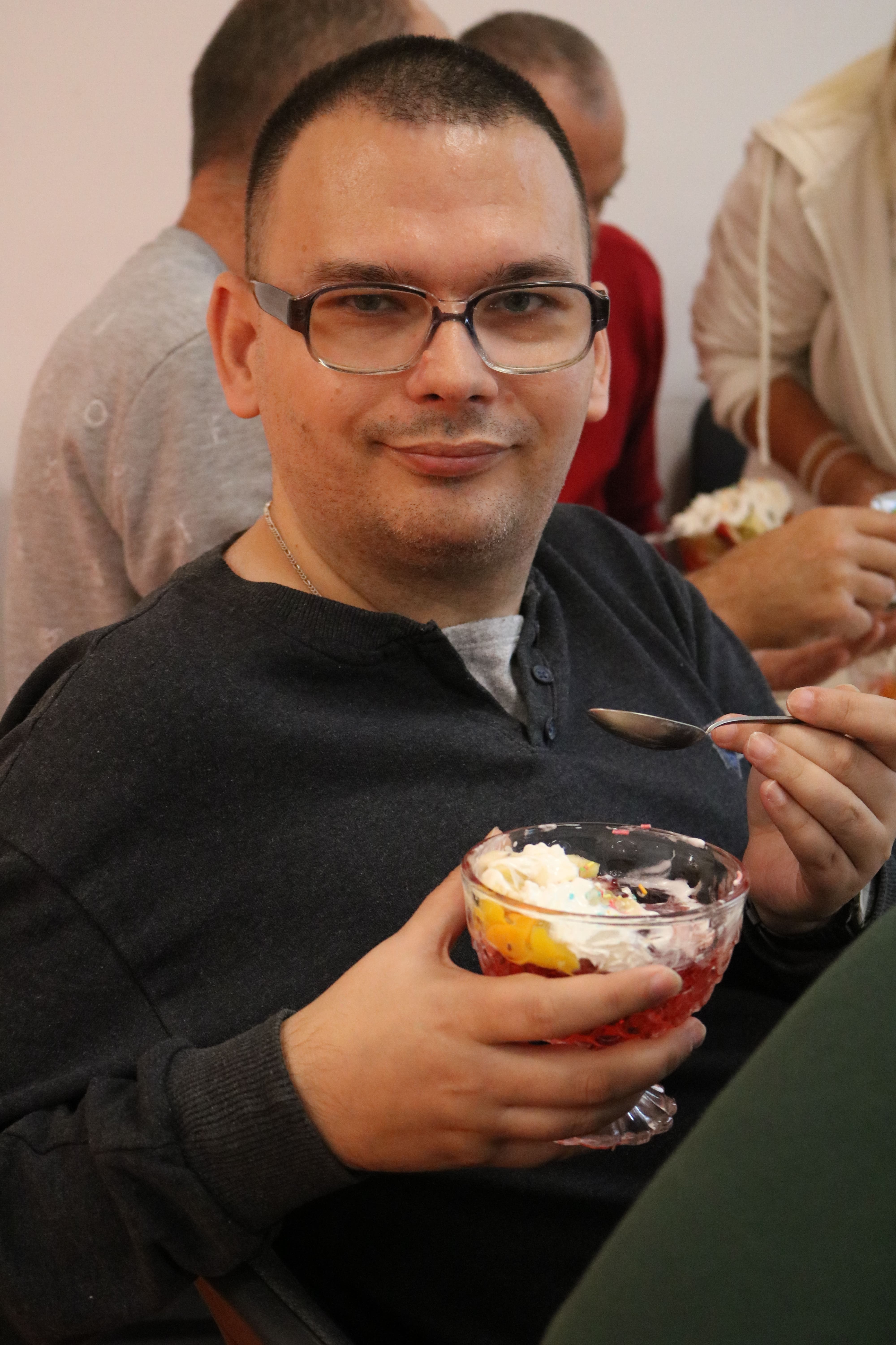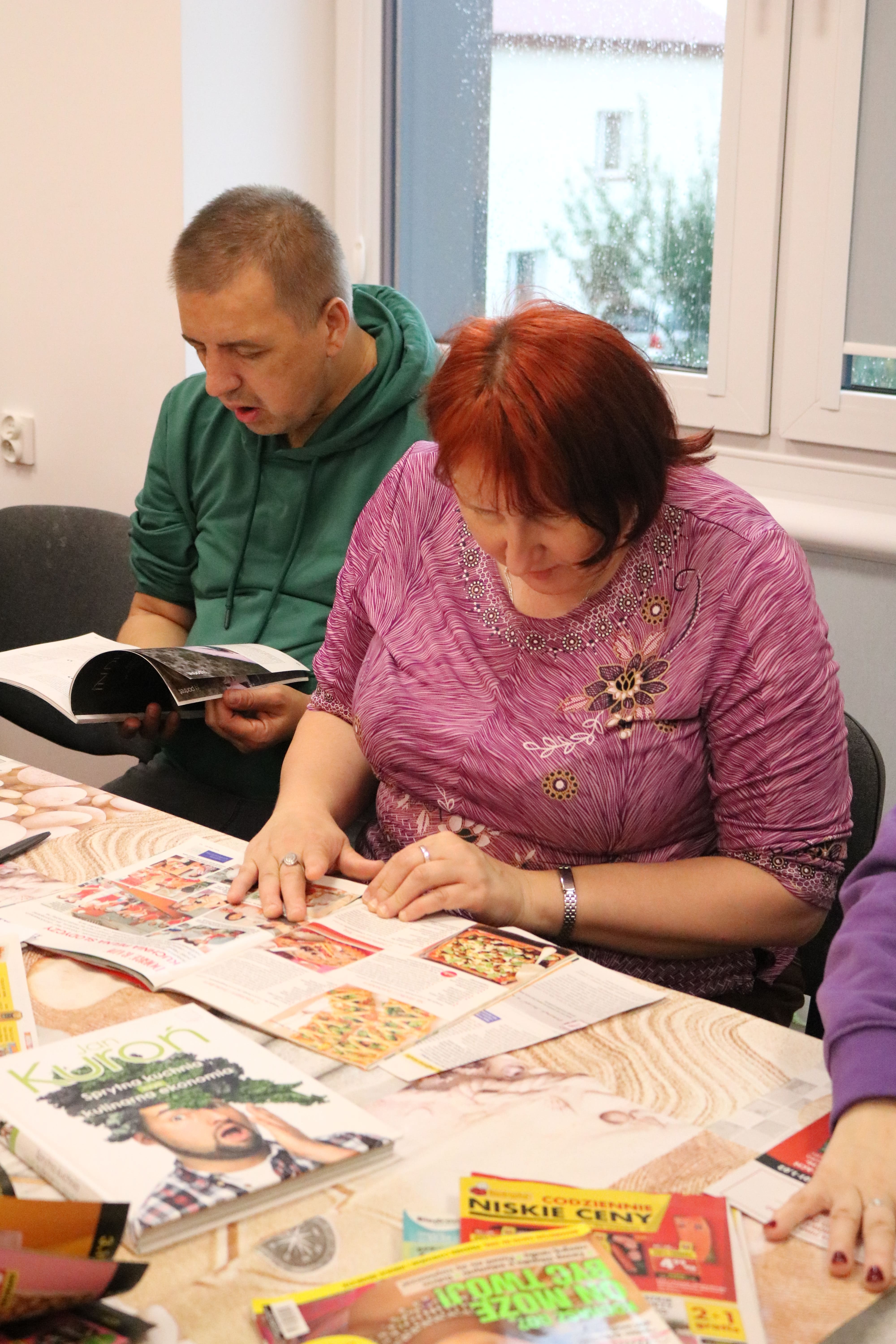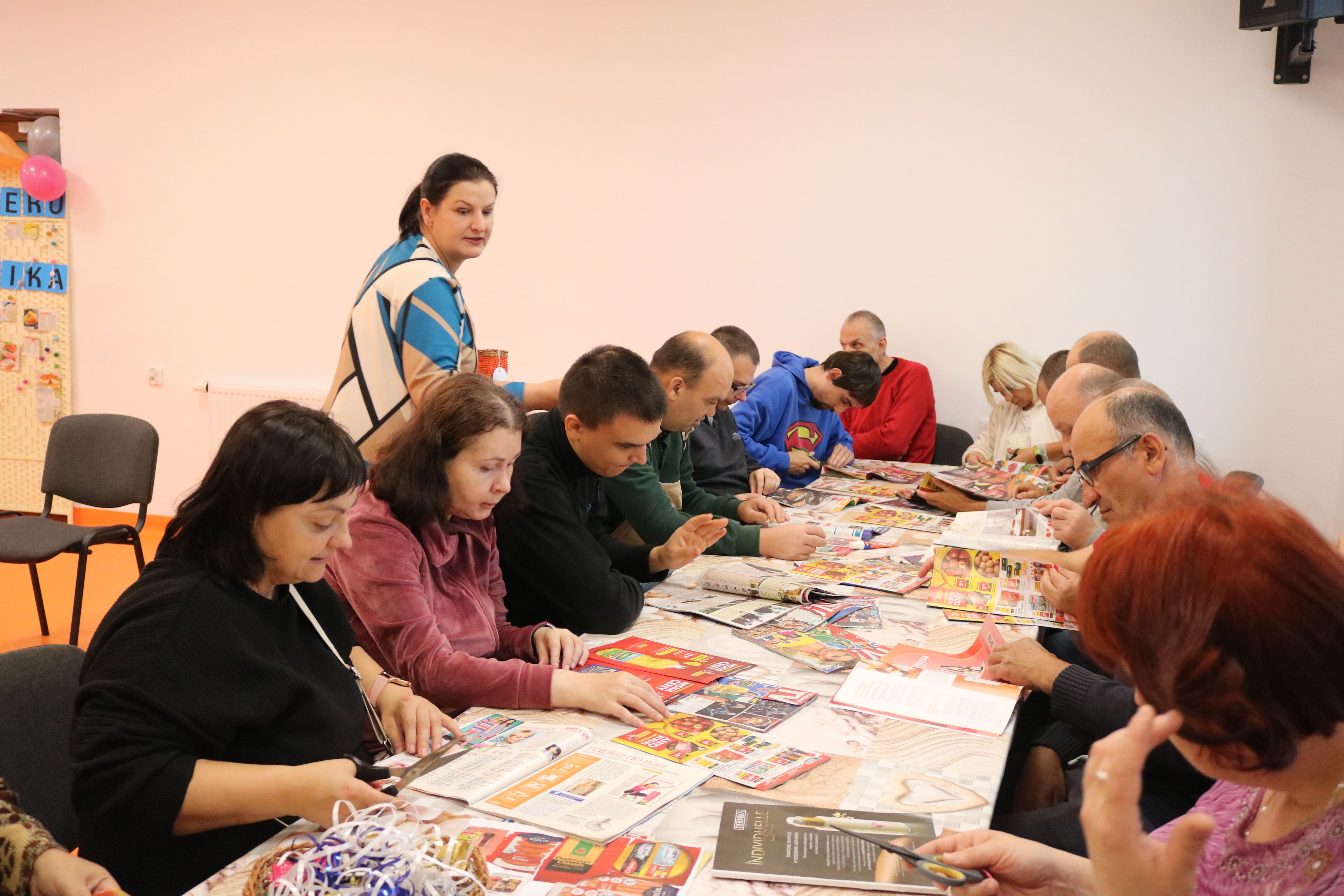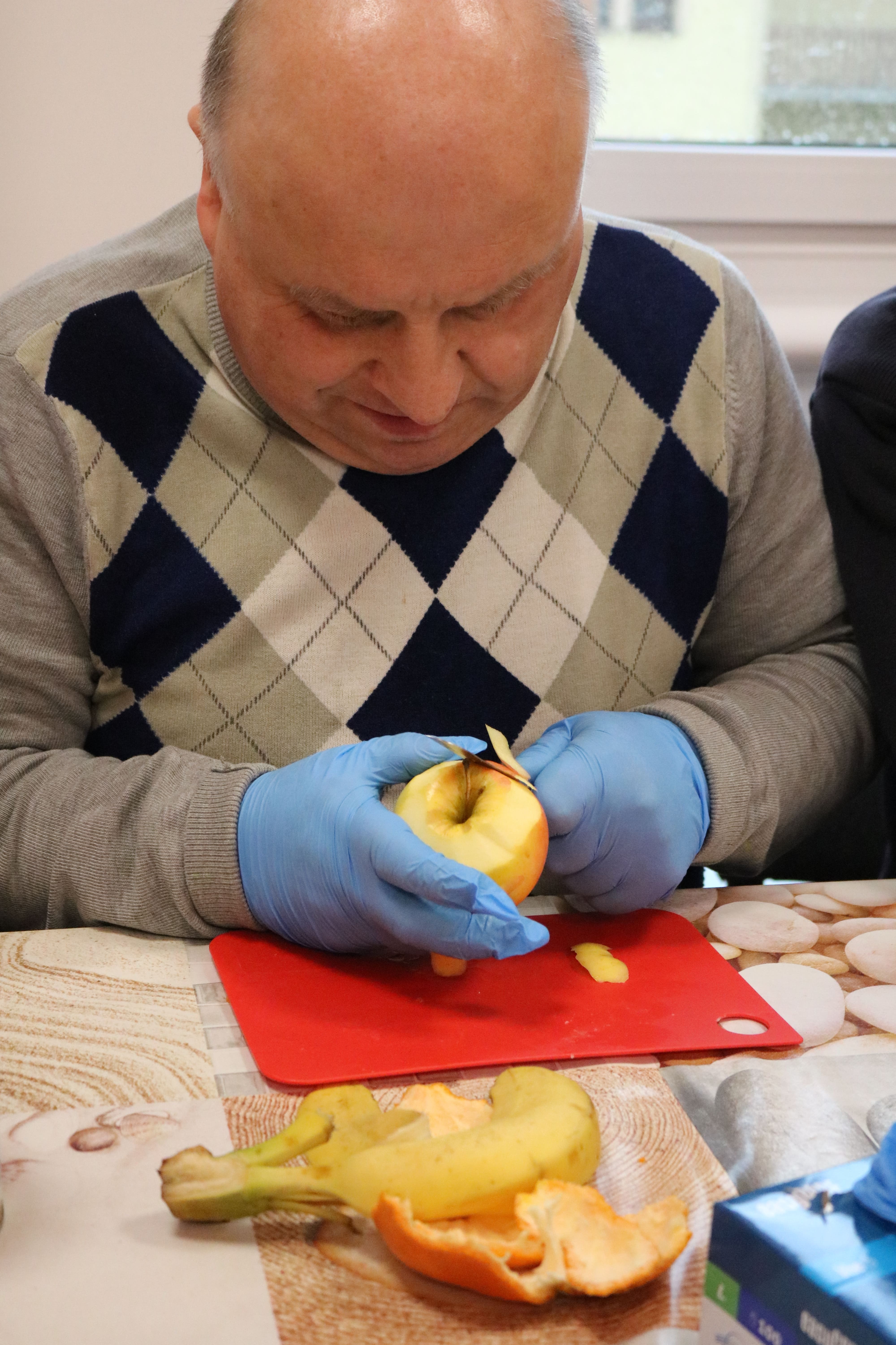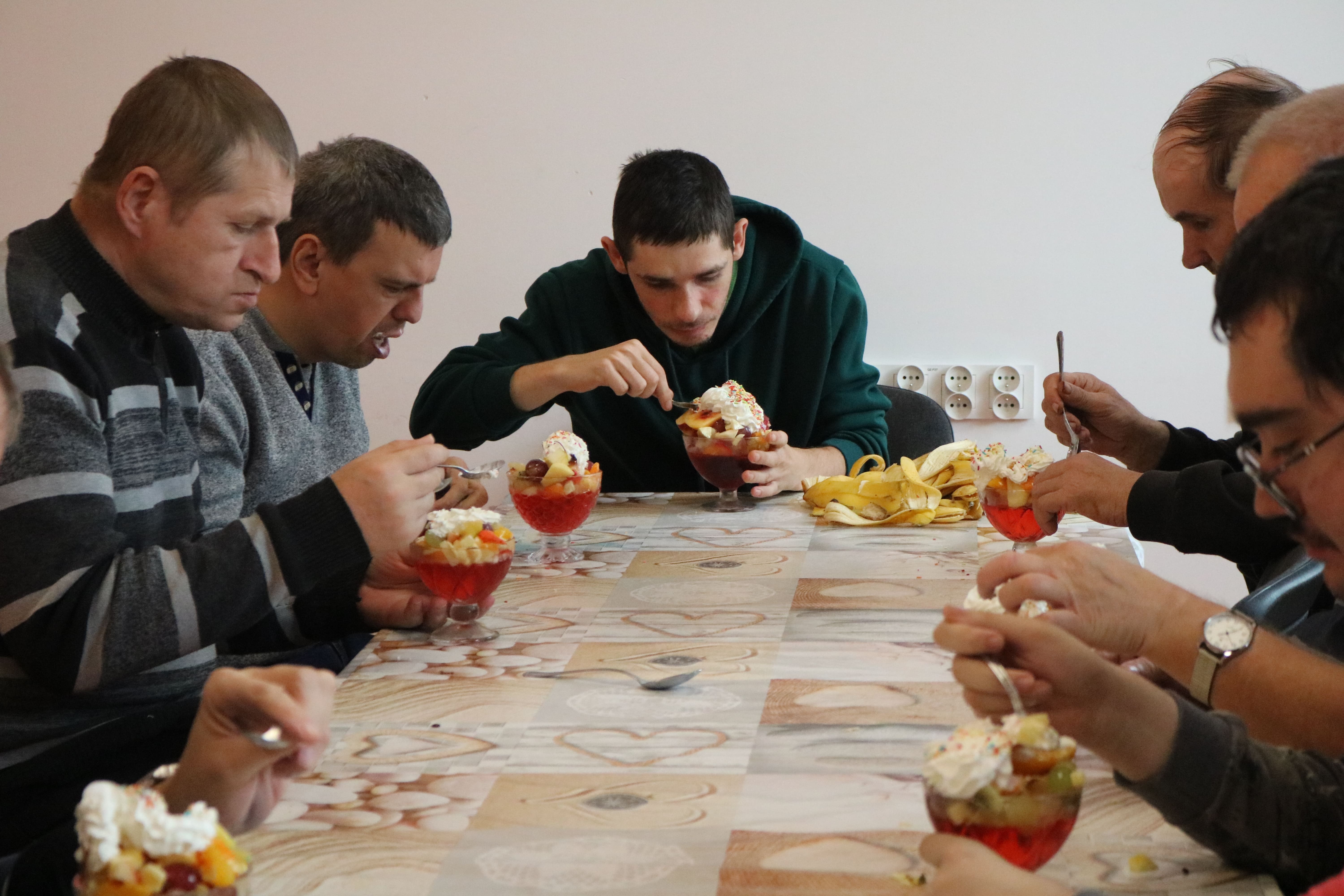 Kulminacyjnym punktem zajęć było wspólne przygotowywanie deserów. Pod opieką instruktorów uczestnicy przygotowali stanowiska pracy i przystąpili do wykonania zadania. Poznali zasady prawidłowego obchodzenia się z owocami oraz dbania o higienę i bezpieczeństwo w kuchni. W trakcie tego etapu obierali owoce, kroili je na odpowiednie kawałki, a następnie tworzyli własne desery, wykorzystując galaretki i inne dodatki. Po skończeniu własnych kompozycji deserowych, nadszedł czas na degustację. To był pełen radości i dumy moment, gdy uczestnicy mogli spróbować efektów swojej pracy. Po wspólnej „smacznej integracji” wszyscy zabrali się do sprzątania stanowisk, wykonując to zadanie z zaangażowaniem oraz dużą odpowiedzialnością, dbając o porządek.
