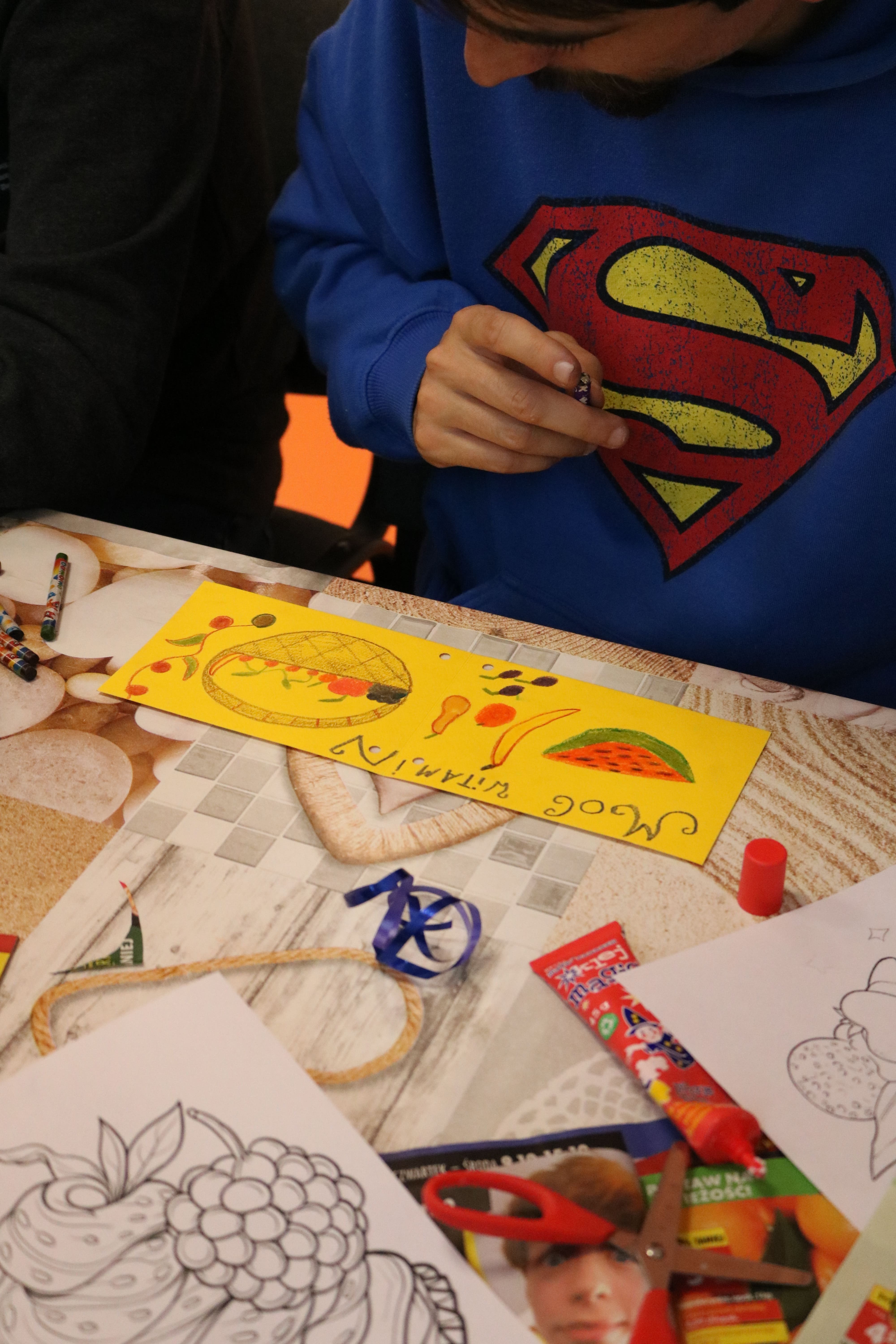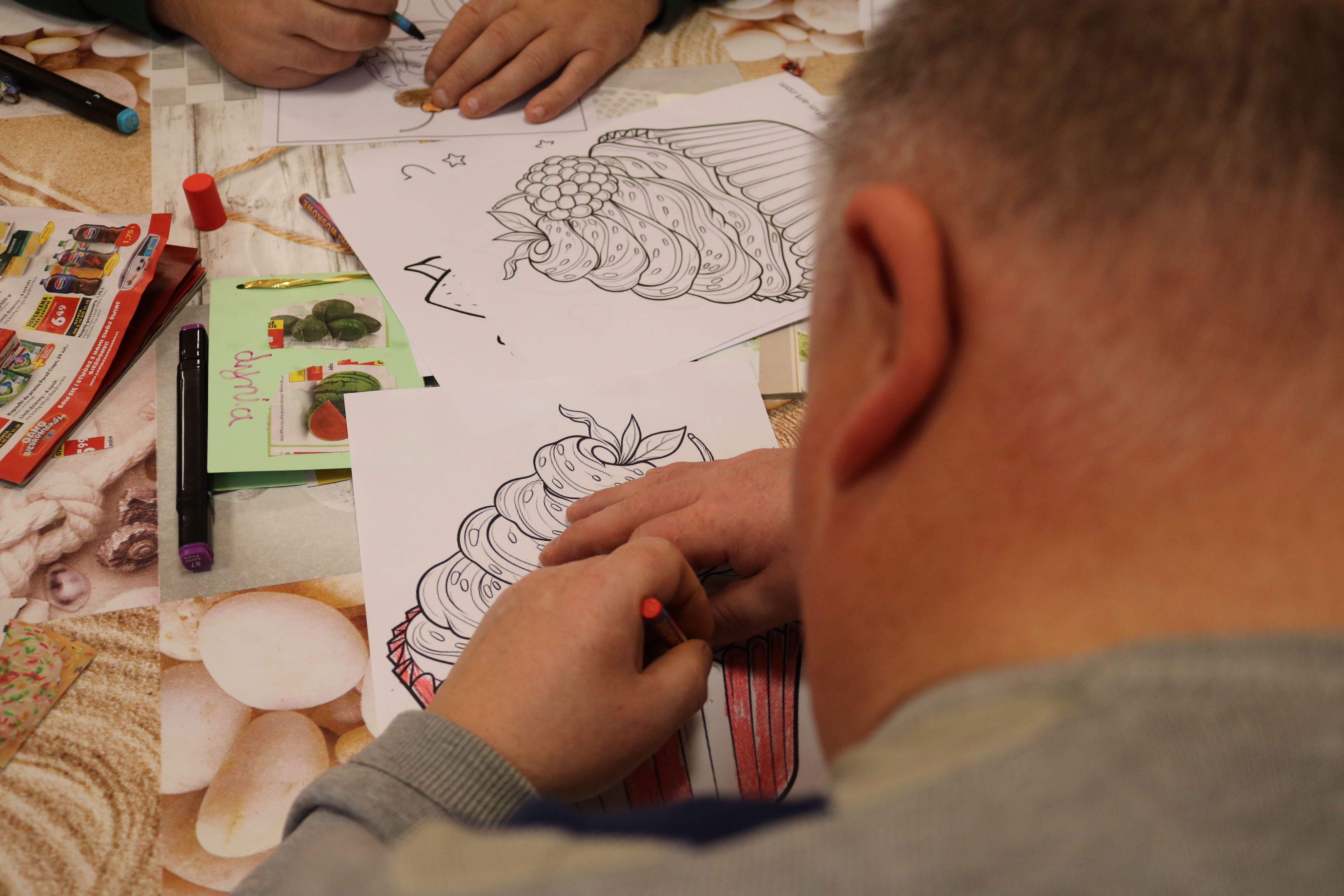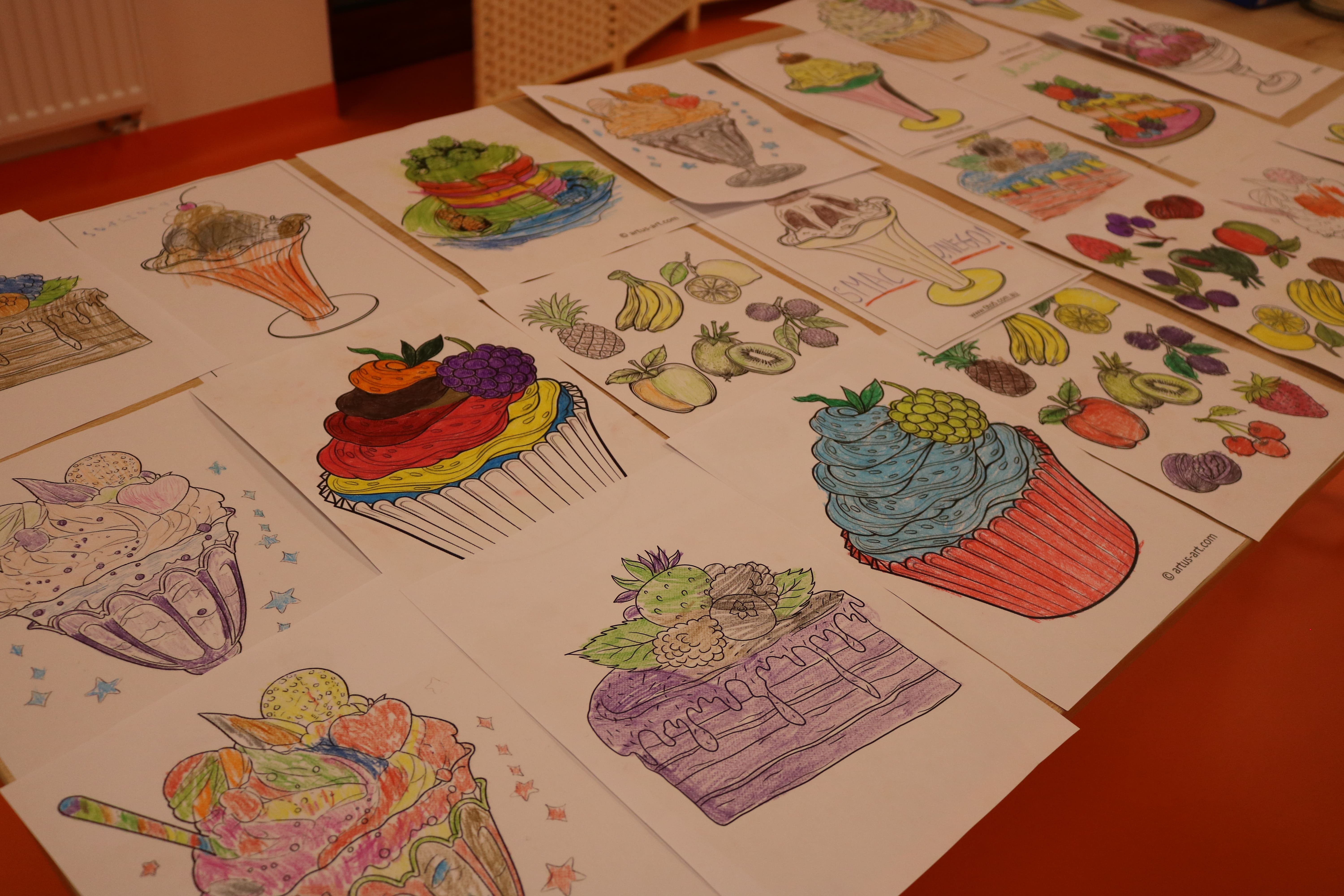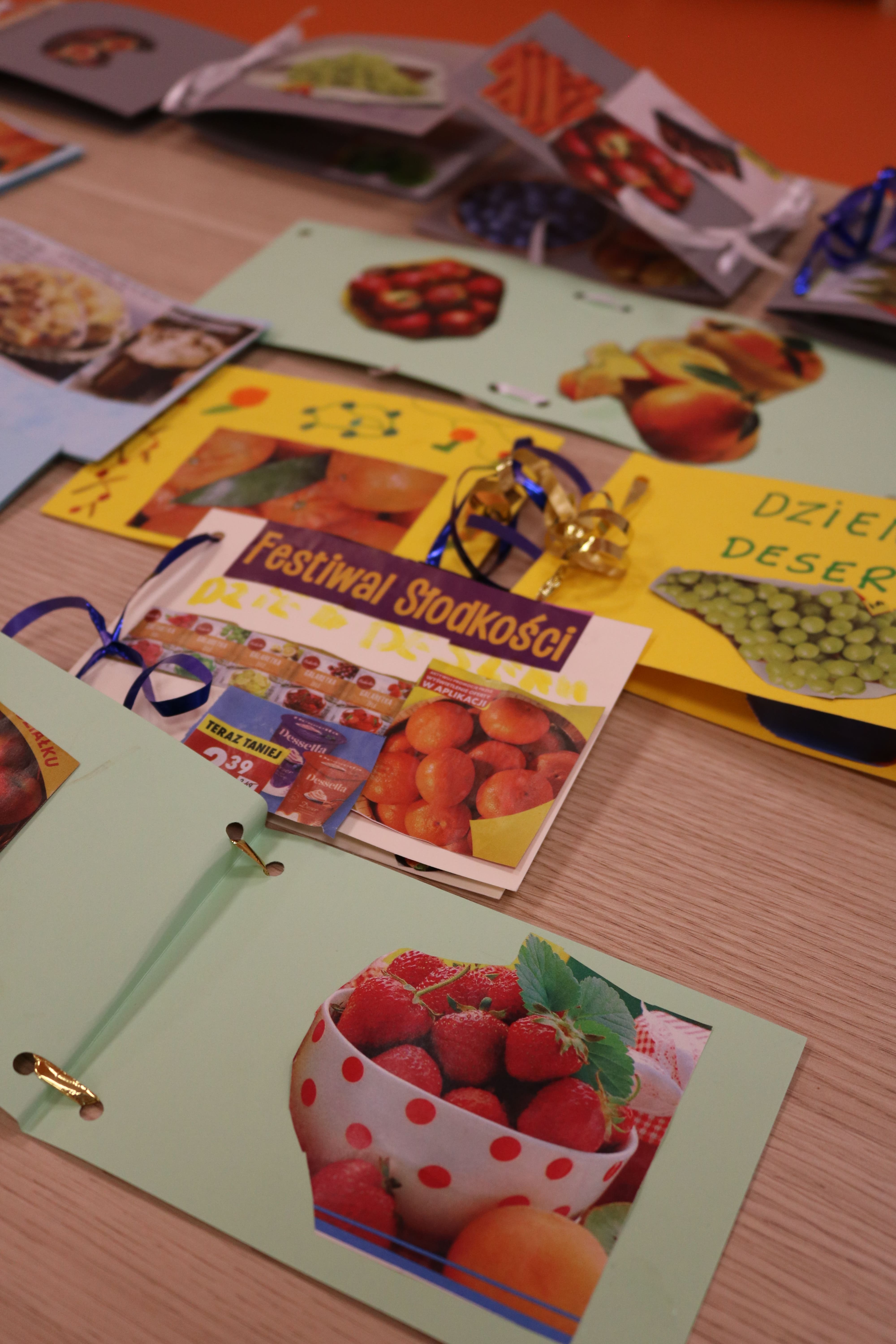 Kolejnym etapem spotkania były zajęcia plastyczne, które pozwoliły uczestnikom wyrazić swoją twórczość poprzez tworzenie kolaży. Każdy z uczestników stworzył album przedstawiający ulubione owoce i deserowe kompozycje. Dzięki tej aktywności rozwijali zdolności manualne i wyobraźnię artystyczną. Powstałe prace pełniły również funkcję edukacyjną, pomagając zrozumieć, jak owoce mogą stać się bazą do przygotowania zdrowych i smacznych deserów. Następnym elementem zajęć było kolorowanie obrazków o tematyce deserowej, co stanowiło okazję do wyrażenia własnych pomysłów w doborze kolorystyki.