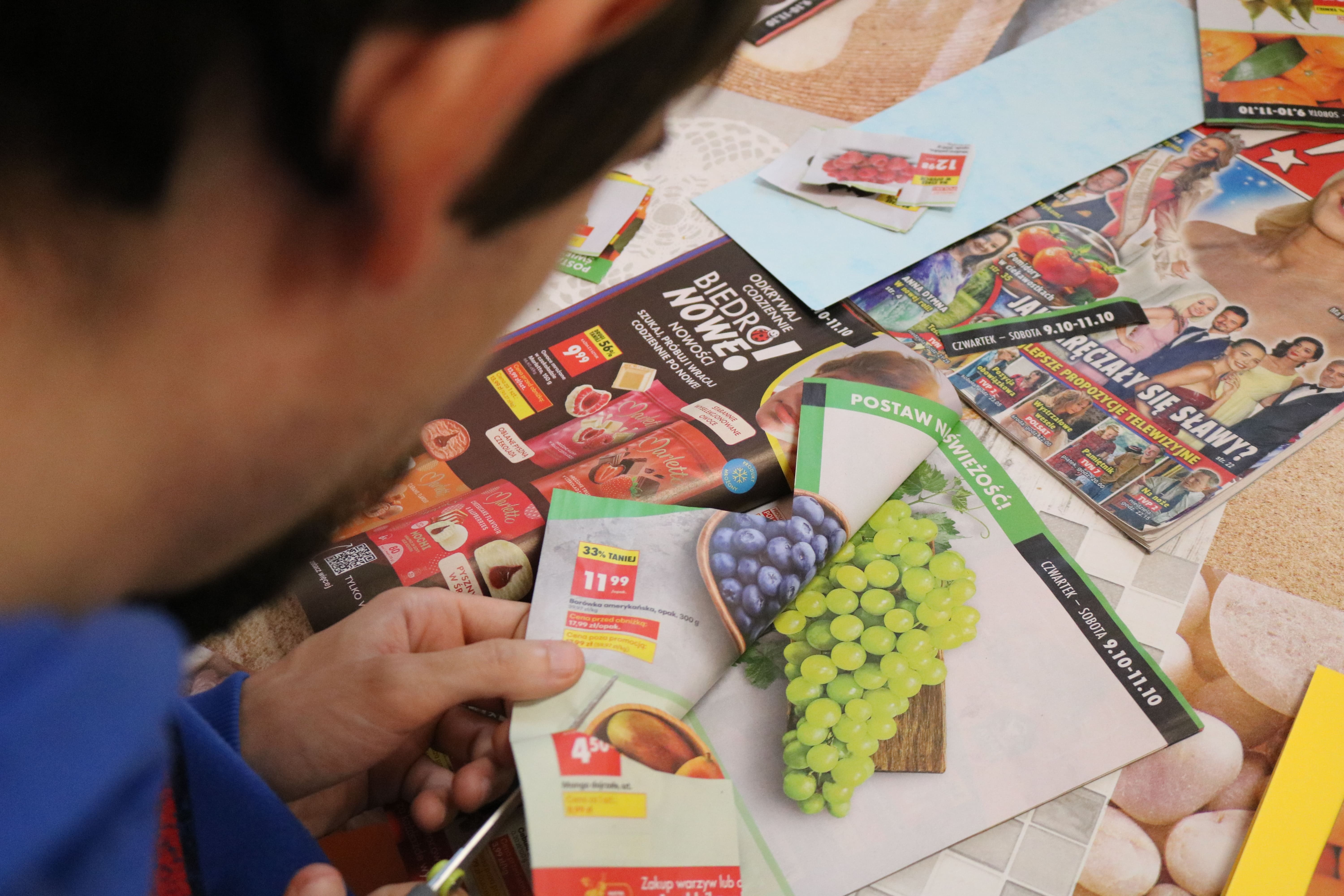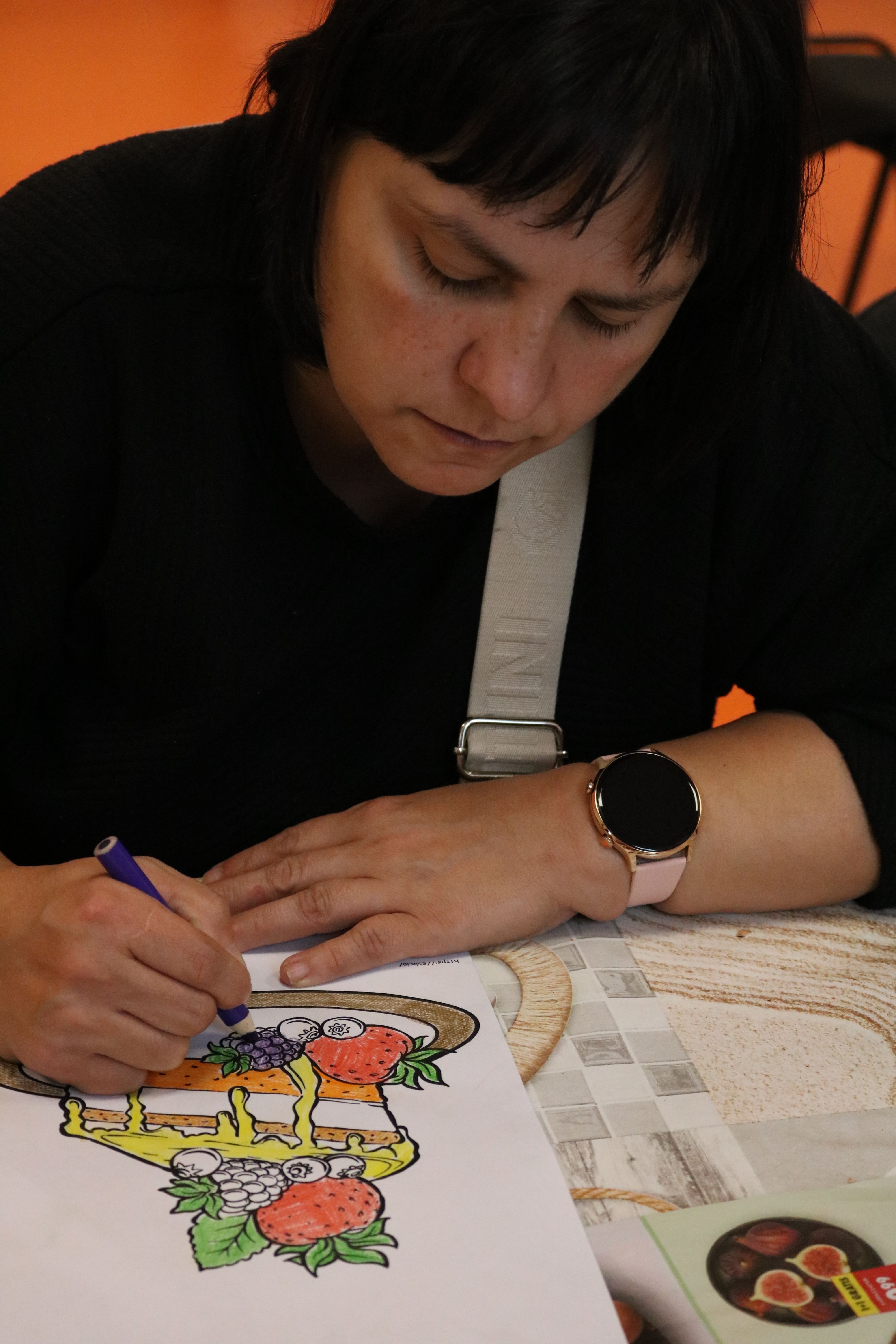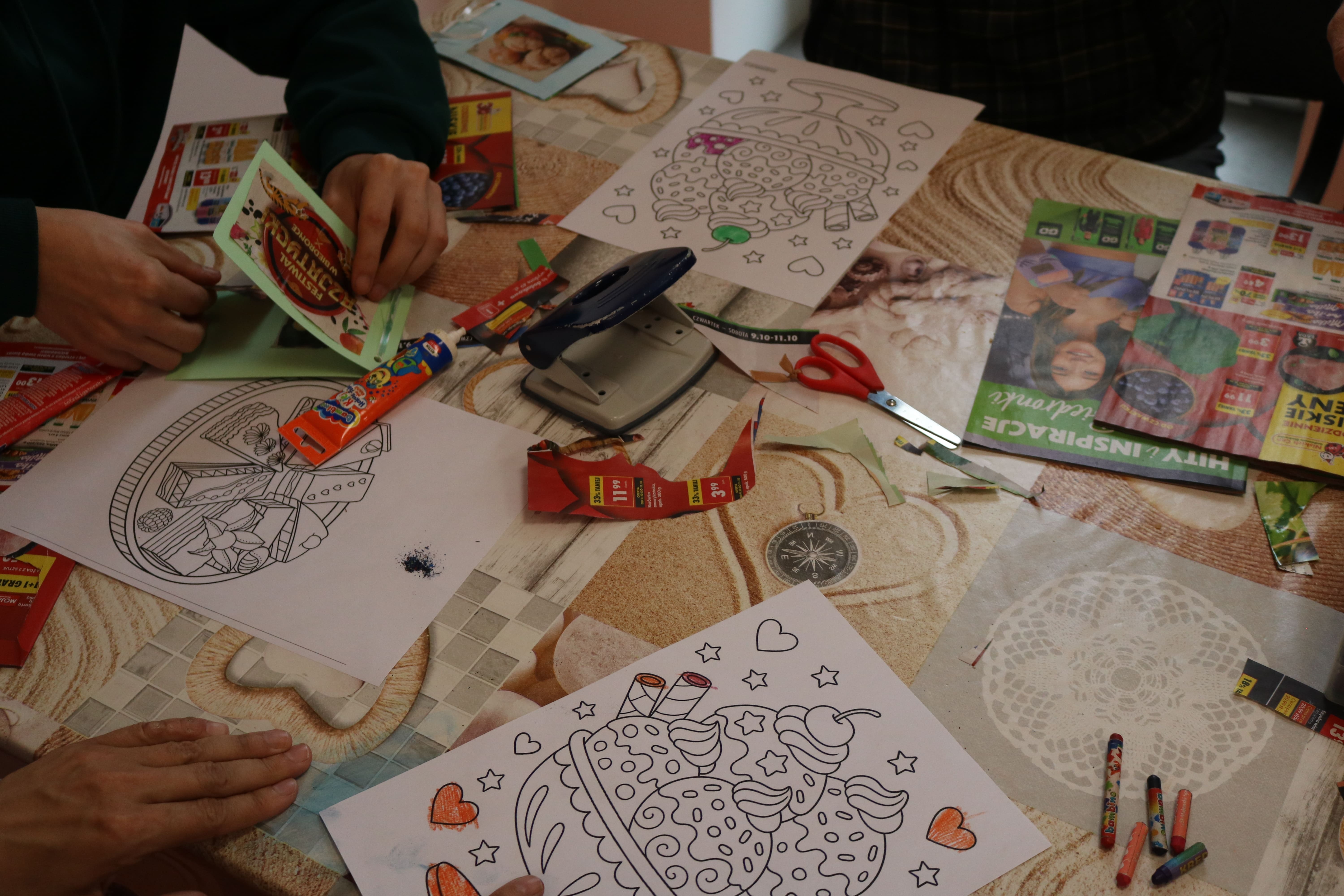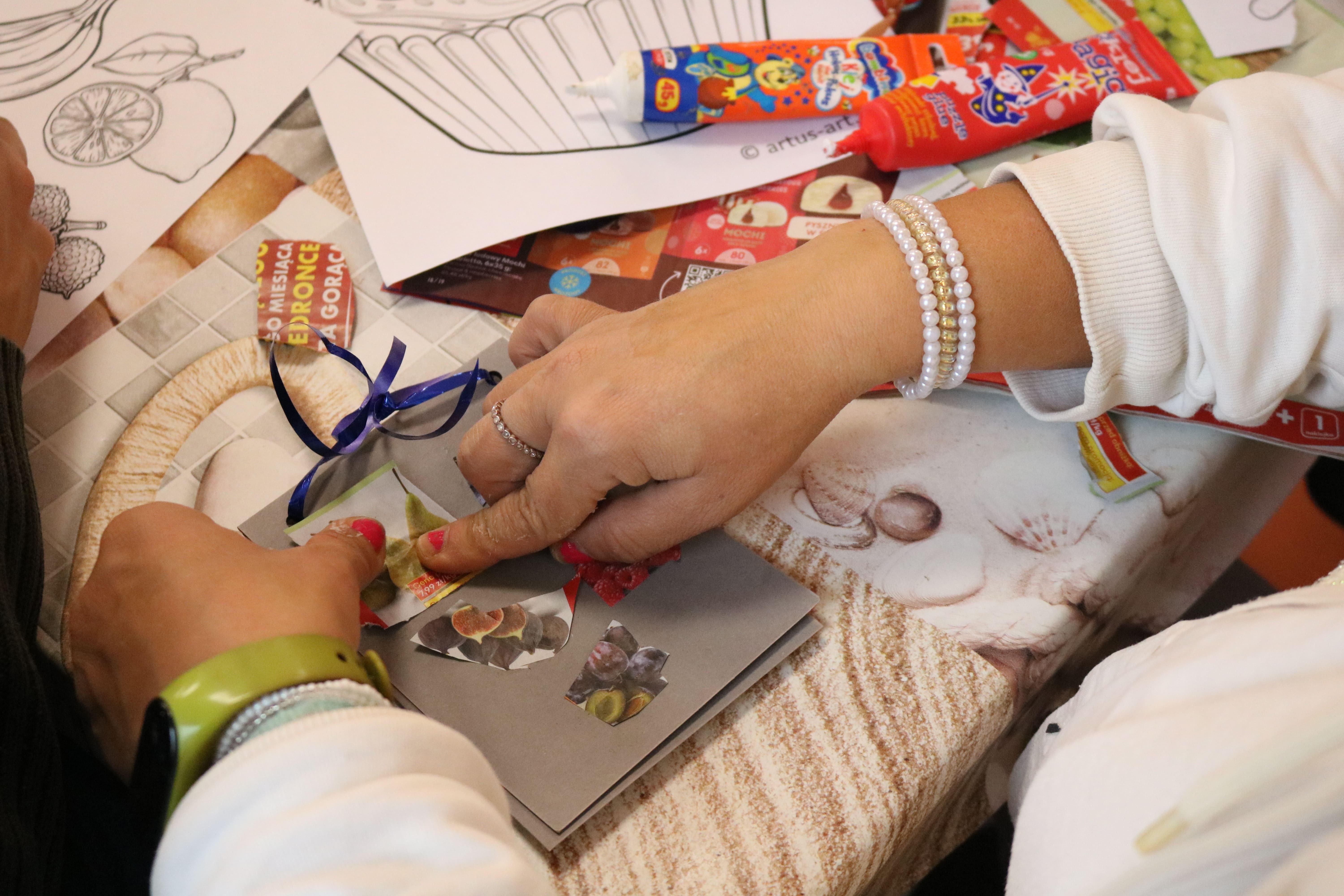 Kolejnym etapem spotkania były zajęcia plastyczne, które pozwoliły uczestnikom wyrazić swoją twórczość poprzez tworzenie kolaży. Każdy z uczestników stworzył album przedstawiający ulubione owoce i deserowe kompozycje. Dzięki tej aktywności rozwijali zdolności manualne i wyobraźnię artystyczną. Powstałe prace pełniły również funkcję edukacyjną, pomagając zrozumieć, jak owoce mogą stać się bazą do przygotowania zdrowych i smacznych deserów. Następnym elementem zajęć było kolorowanie obrazków o tematyce deserowej, co stanowiło okazję do wyrażenia własnych pomysłów w doborze kolorystyki.