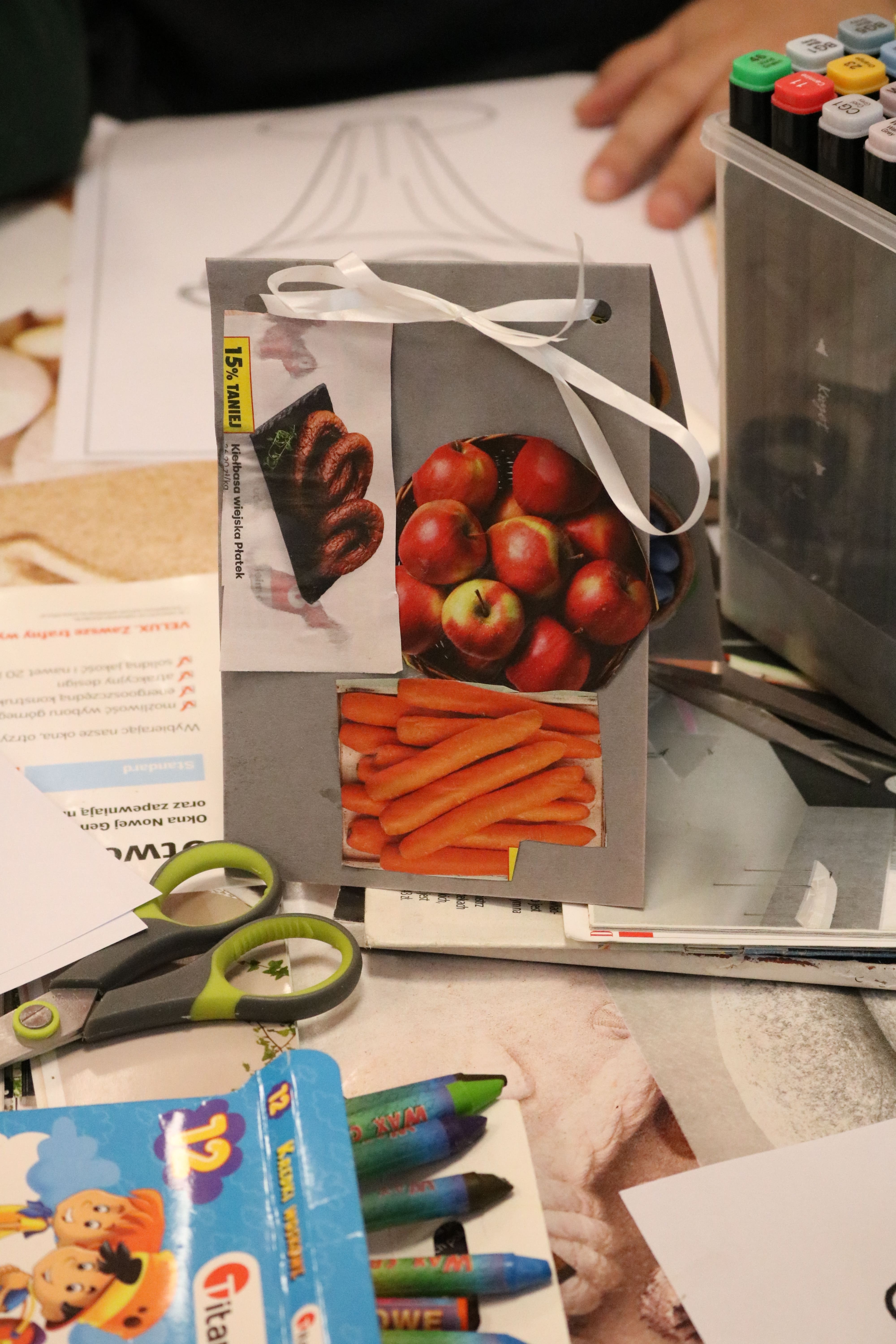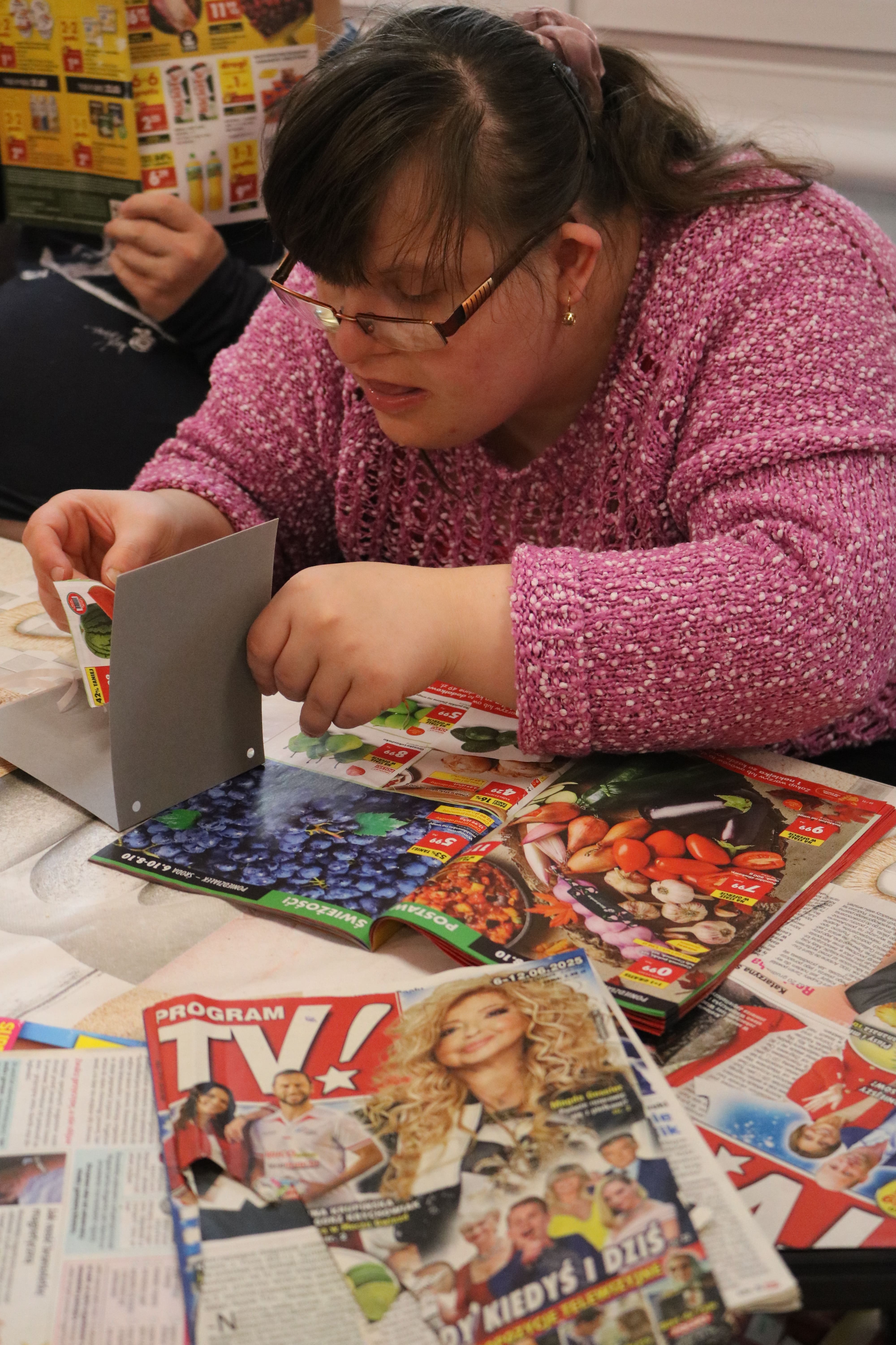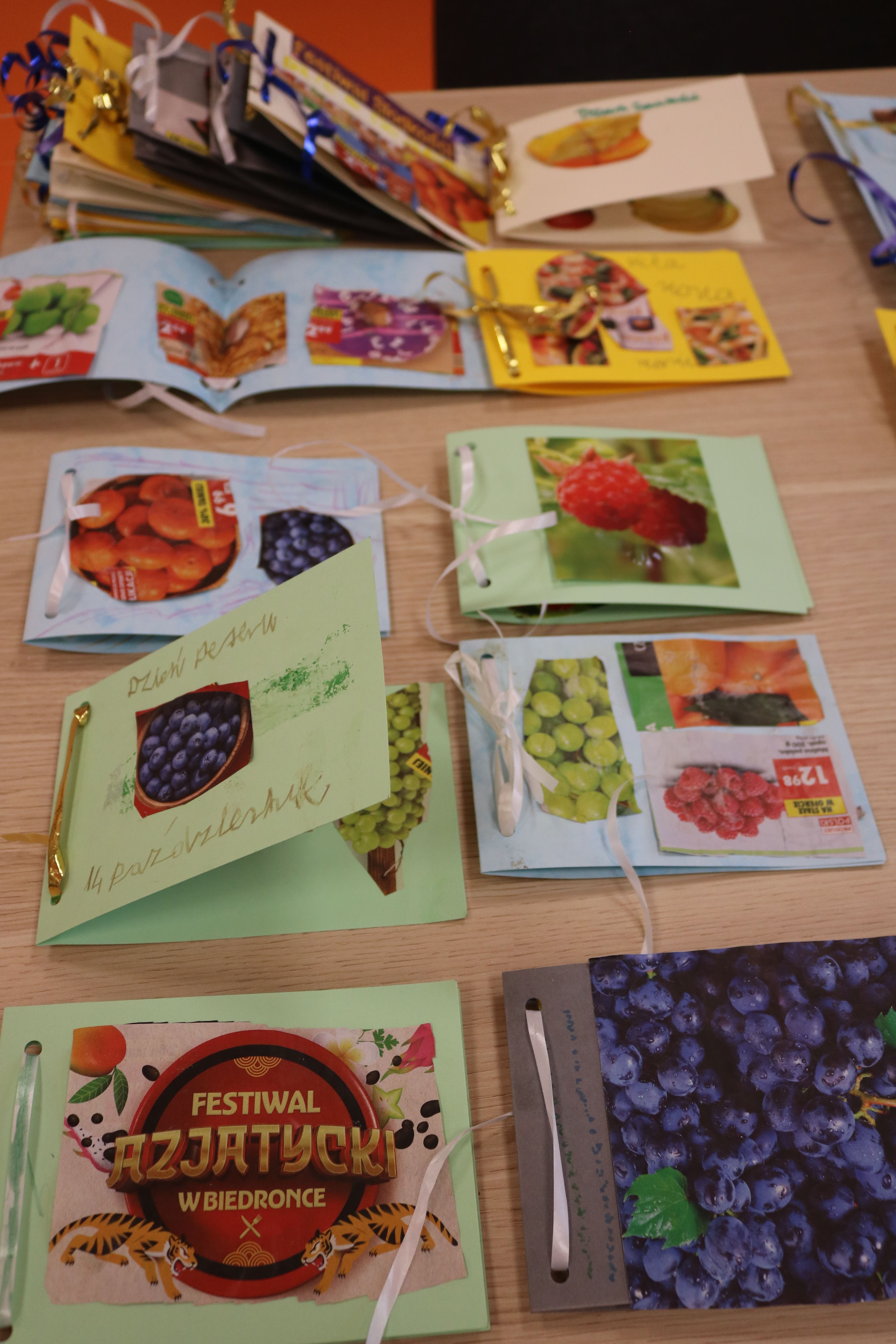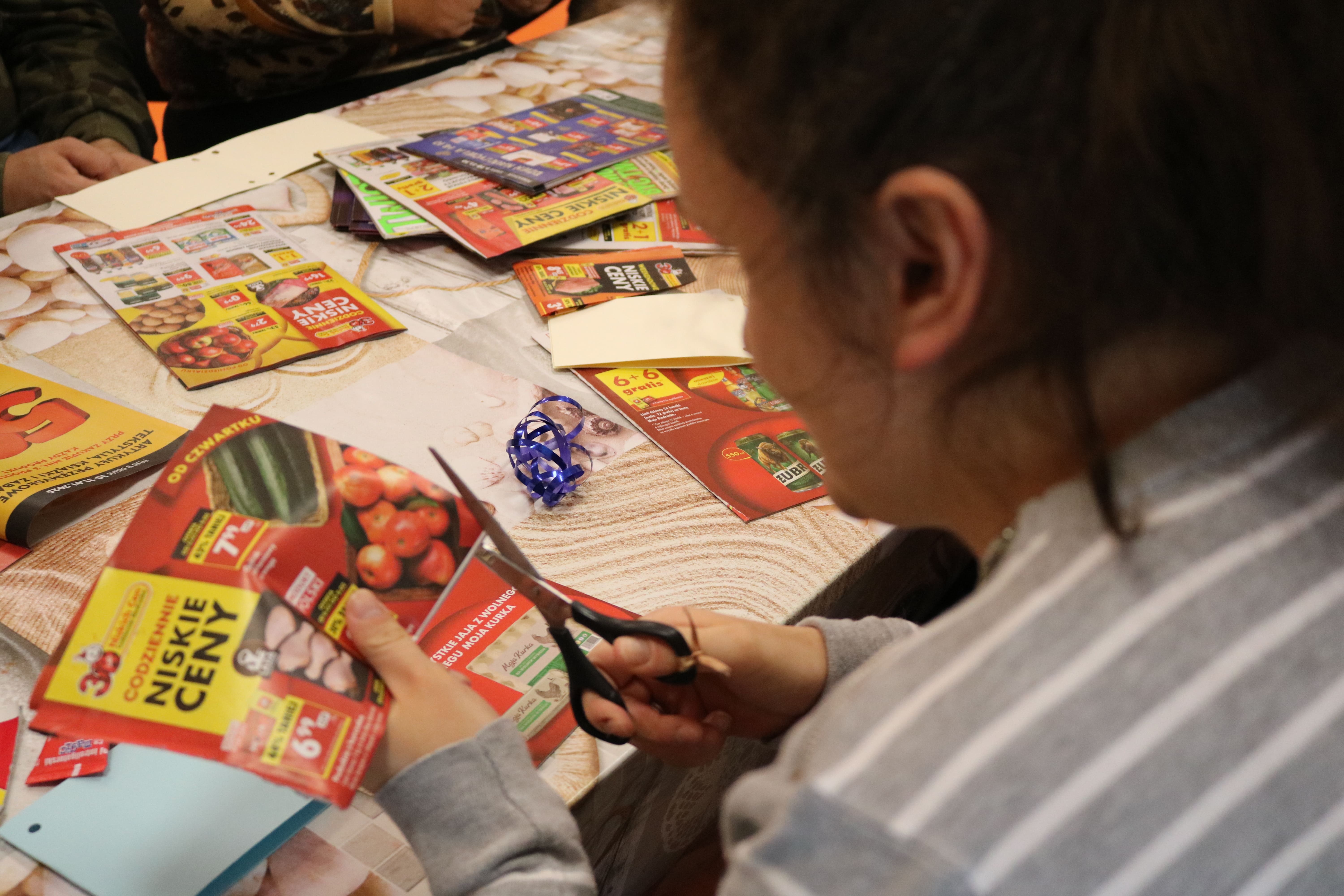 Kolejnym etapem spotkania były zajęcia plastyczne, które pozwoliły uczestnikom wyrazić swoją twórczość poprzez tworzenie kolaży. Każdy z uczestników stworzył album przedstawiający ulubione owoce i deserowe kompozycje. Dzięki tej aktywności rozwijali zdolności manualne i wyobraźnię artystyczną. Powstałe prace pełniły również funkcję edukacyjną, pomagając zrozumieć, jak owoce mogą stać się bazą do przygotowania zdrowych i smacznych deserów. Następnym elementem zajęć było kolorowanie obrazków o tematyce deserowej, co stanowiło okazję do wyrażenia własnych pomysłów w doborze kolorystyki.